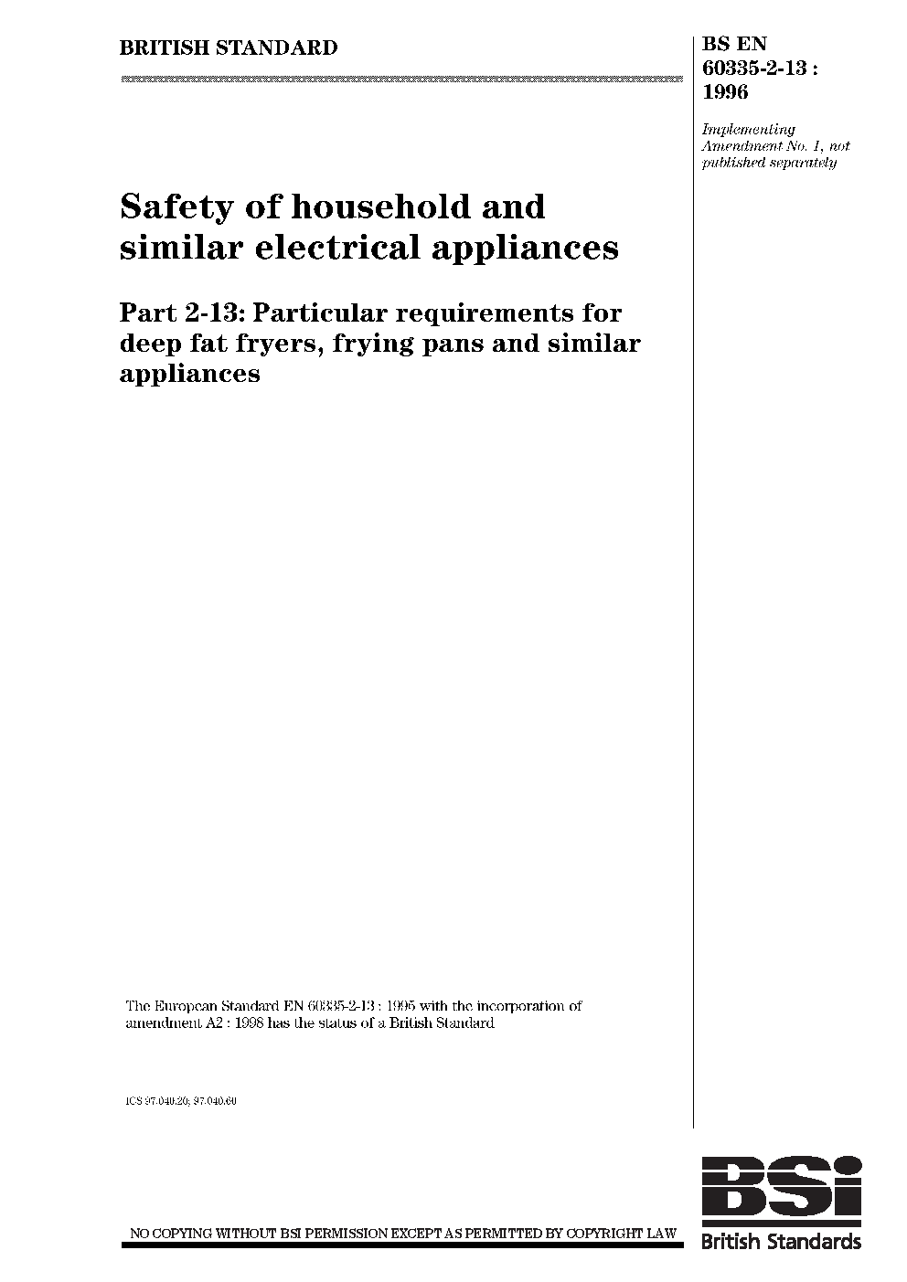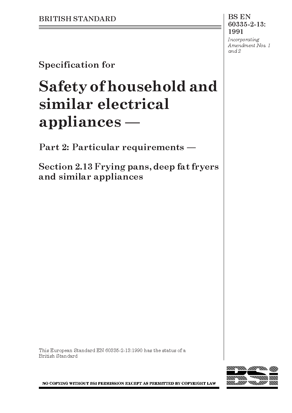 Protected electrical equipment;Domestic safety;Deep fat fryers;Catering equipment;Household equipment;Electrical safety;Frying pans;Rated voltage;Temperature rise;Electrically-operated devices;Performance testing;Safety devices;Electrical household appliances;Cooking appliances;Watertightness tests