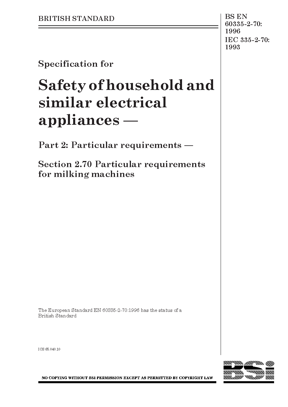 Household and similar electrical appliances. Safety Particular requirements for milking machines