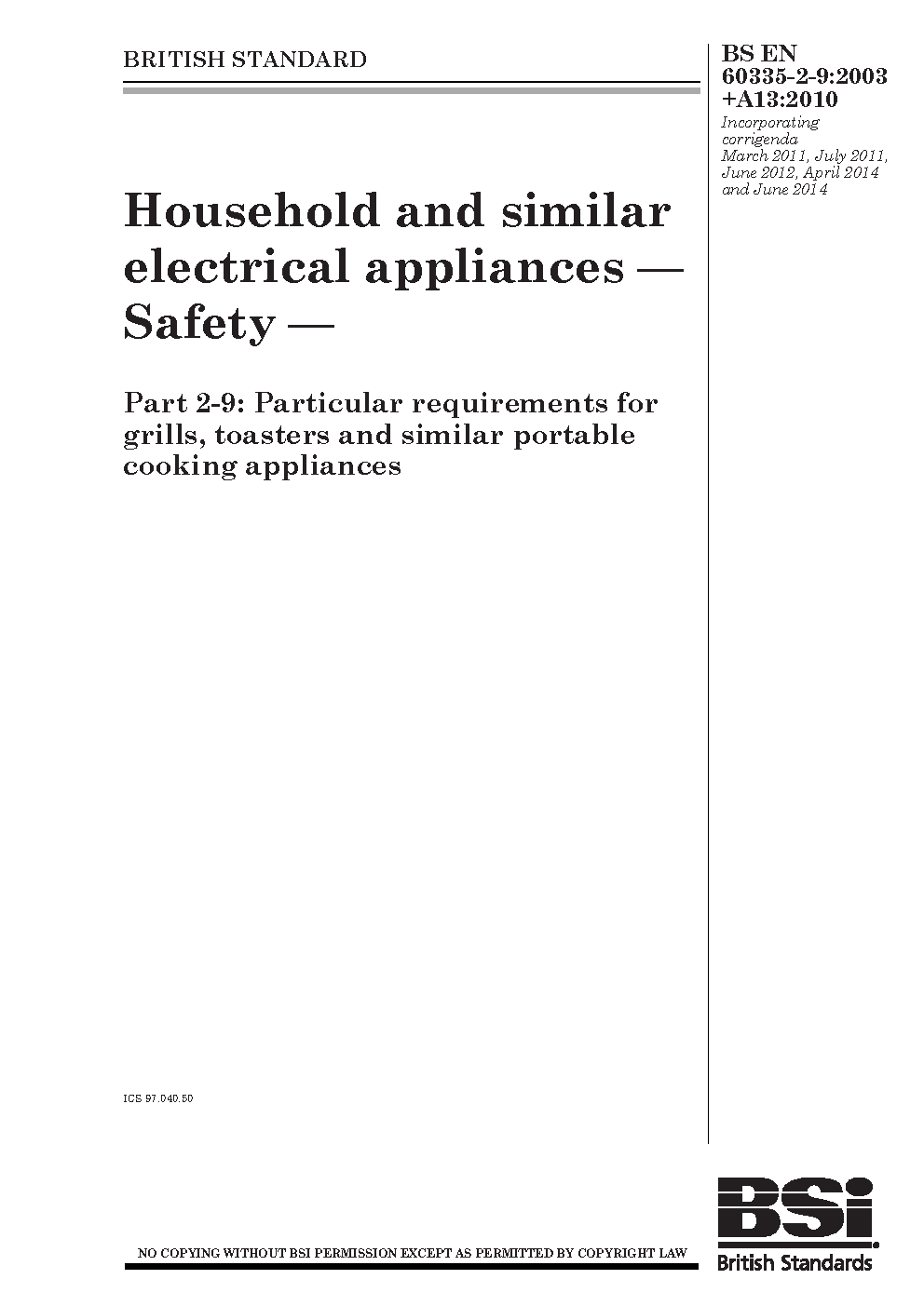 Electrical household appliances;Grills (cooking);Performance testing;Domestic safety;Watertightness tests;Household equipment;Ovens (cooking appliances);Waffle irons;Portable;Electrically-operated devices;Roasting;Instructions for use;Toasters;Protected electrical equipment;Mechanical testing;Electrical safety;Flexible conductors