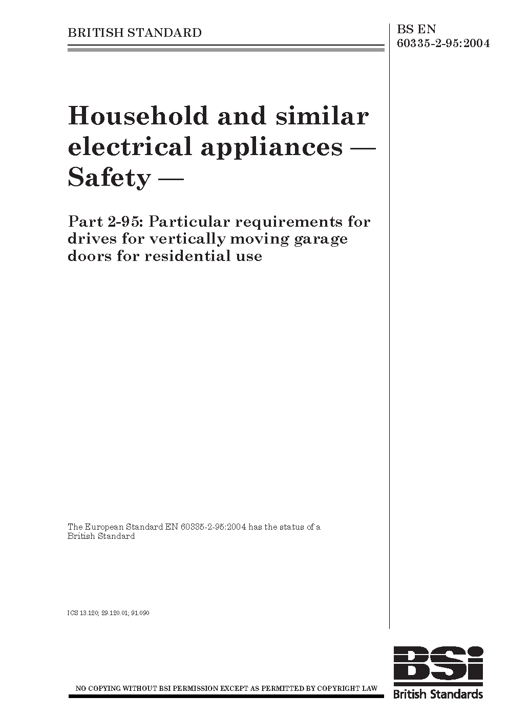 Household and similar electrical appliances. Safety Particular requirements for drives vertically moving garage doors residential use