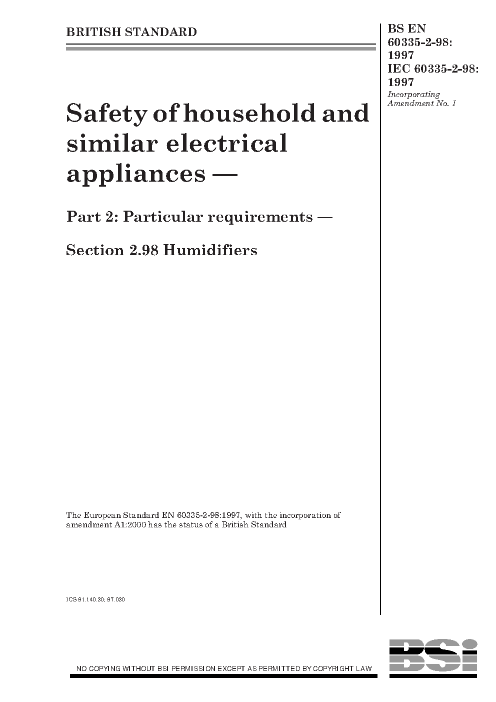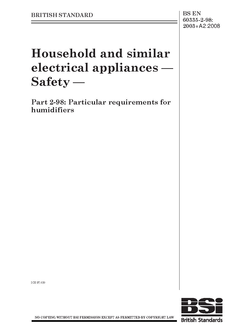 Household and similar electrical appliances. Safety Particular requirements for humidifiers