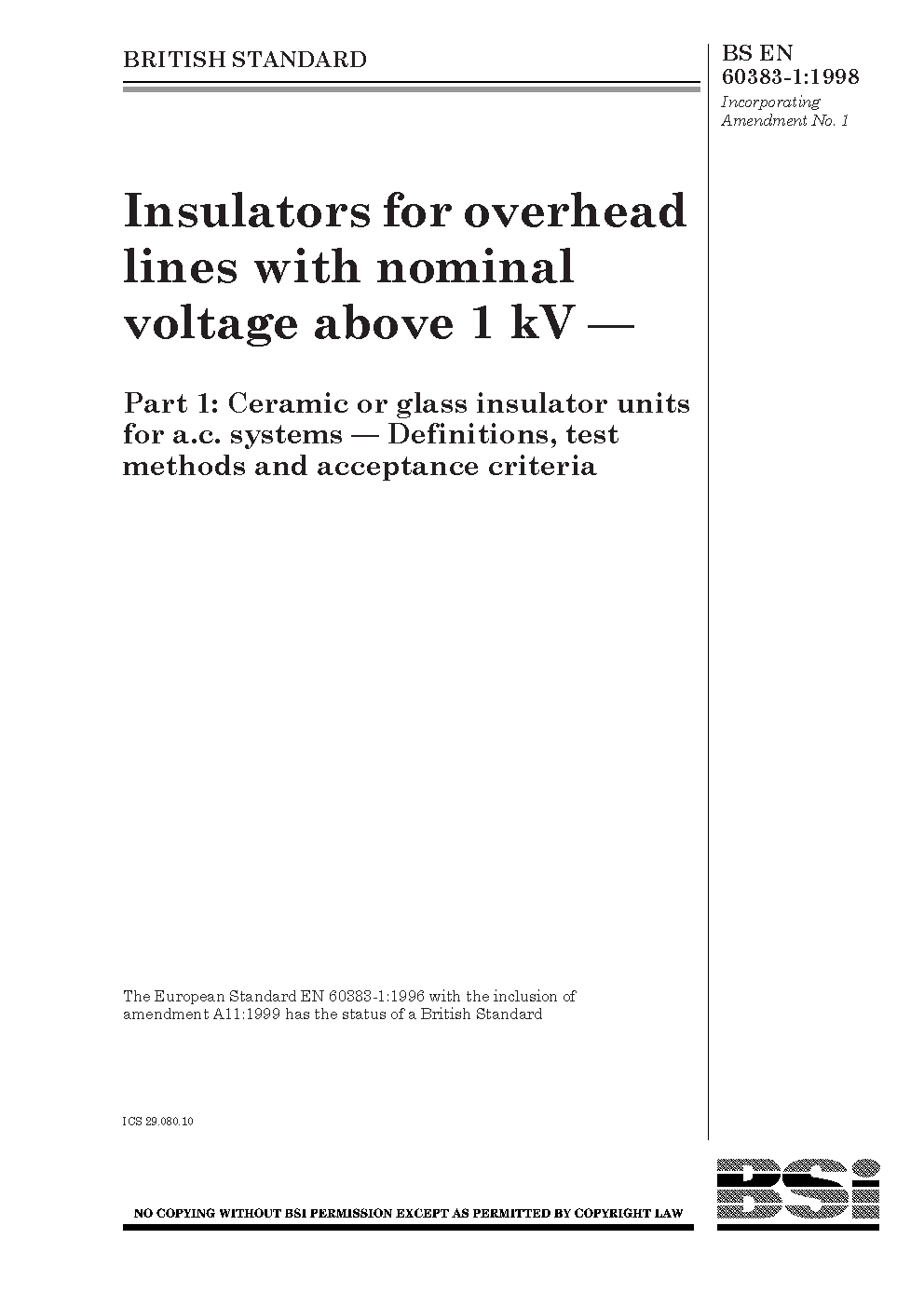 Insulators for overhead lines with a nominal voltage above 1000 V Ceramic or glass insulator units a.c. systems. Definitions, test methods and acceptance criteria