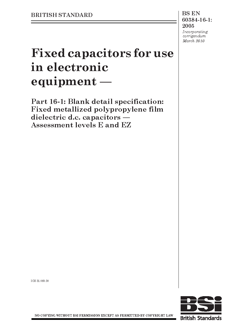 Fixed capacitors for use in electronic equipment Blank detail specification: fixed metallized polypropylene film dielectric d.c. capacitors. Assessment levels E and EZ