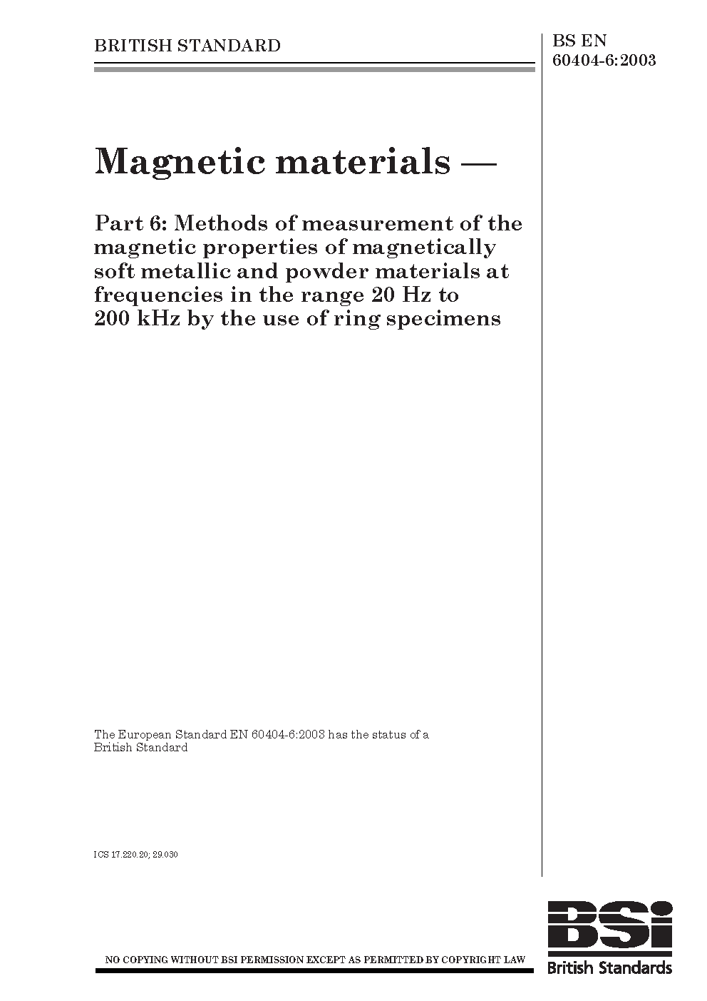 Magnetic materials Methods of measurement the magnetic properties magnetically soft metallic and powder at frequencies in range 20 Hz to 200 kHz by use ring specimens