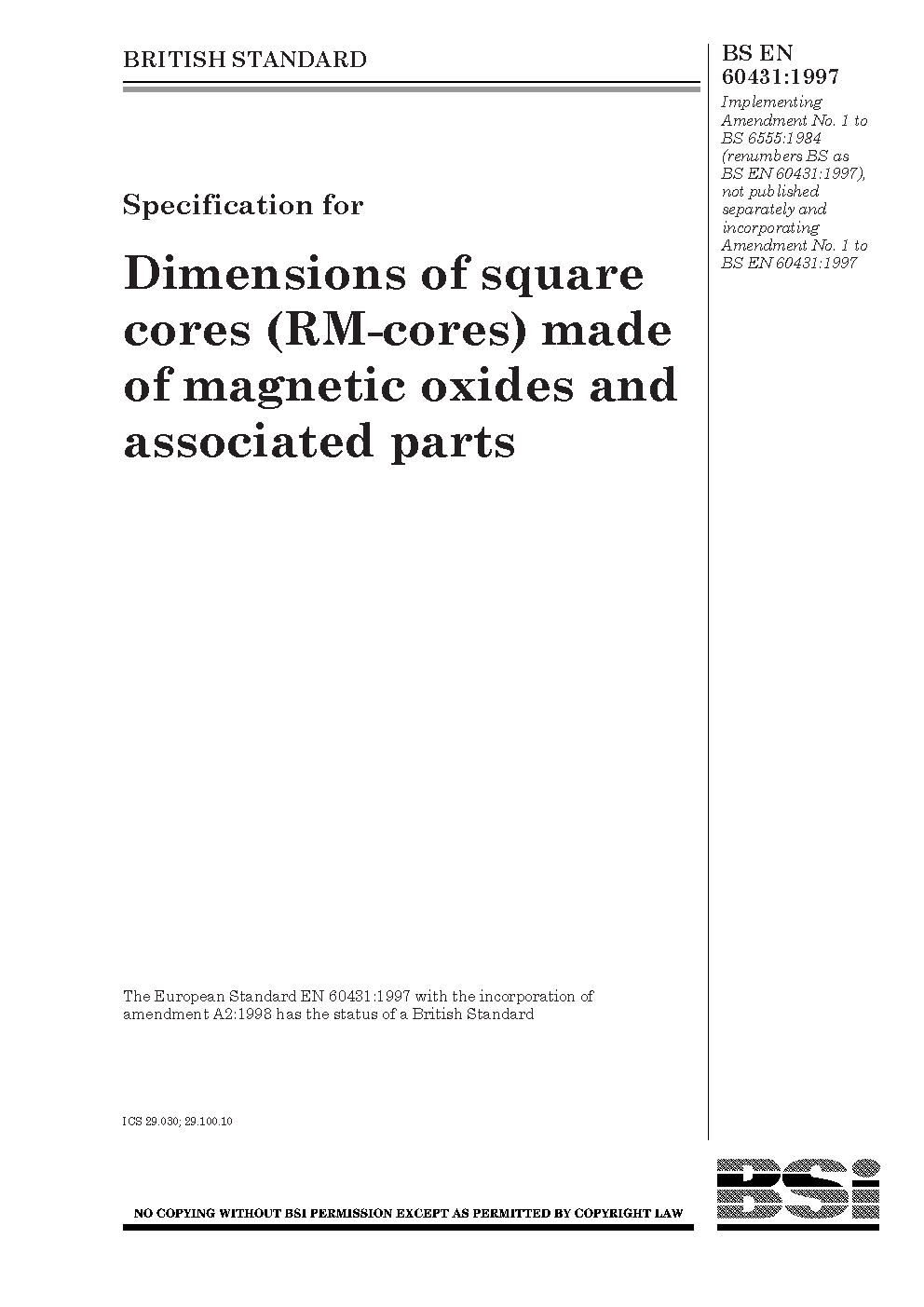 Specification for dimensions of square cores (RM-cores) made of magnetic oxides and associated parts