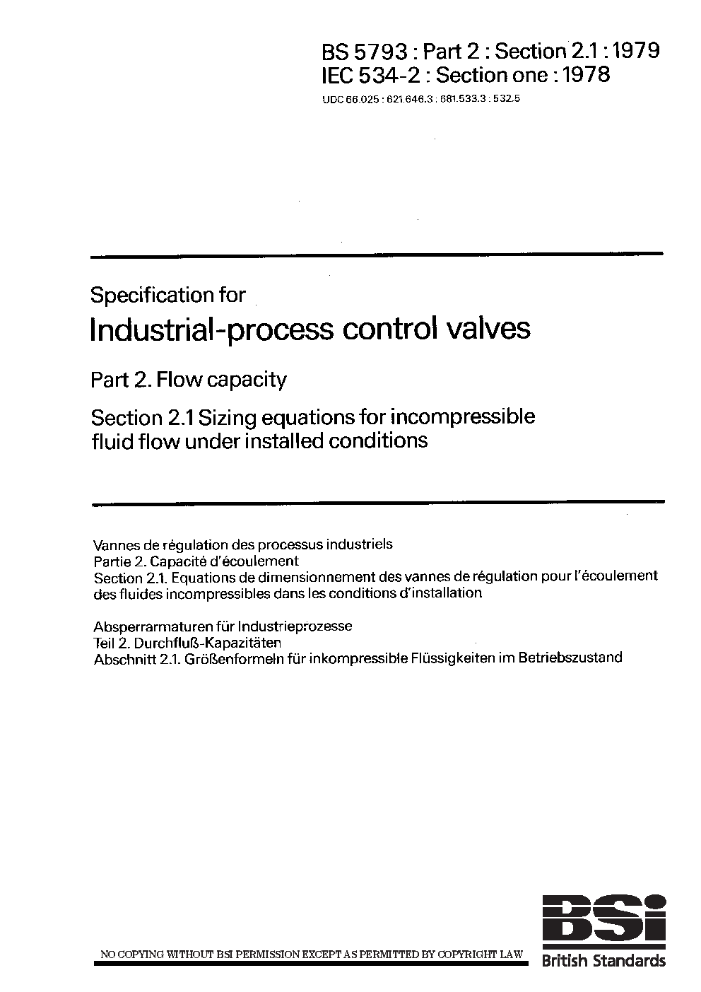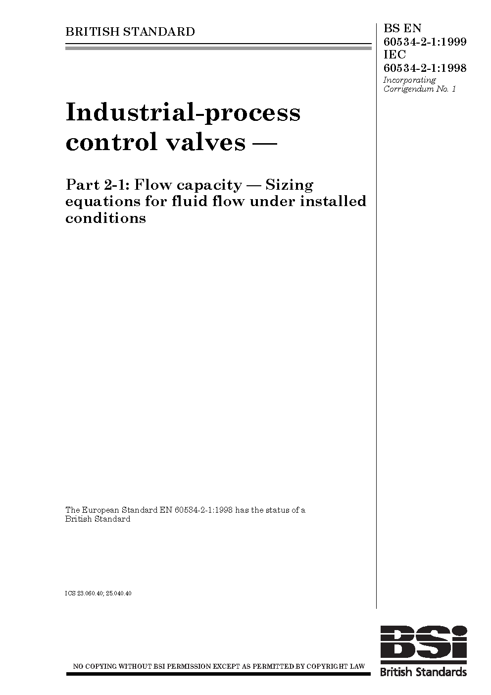 Industrial-process control valves. Flow capacity Sizing equations for incompressible fluid flow under installed conditions