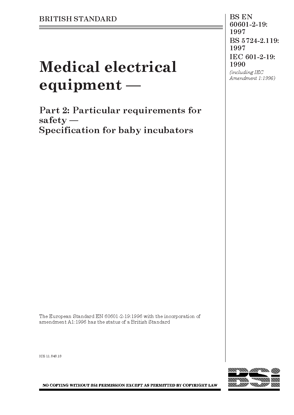 Medical electrical equipment. Particular requirements for safety Specification baby incubators