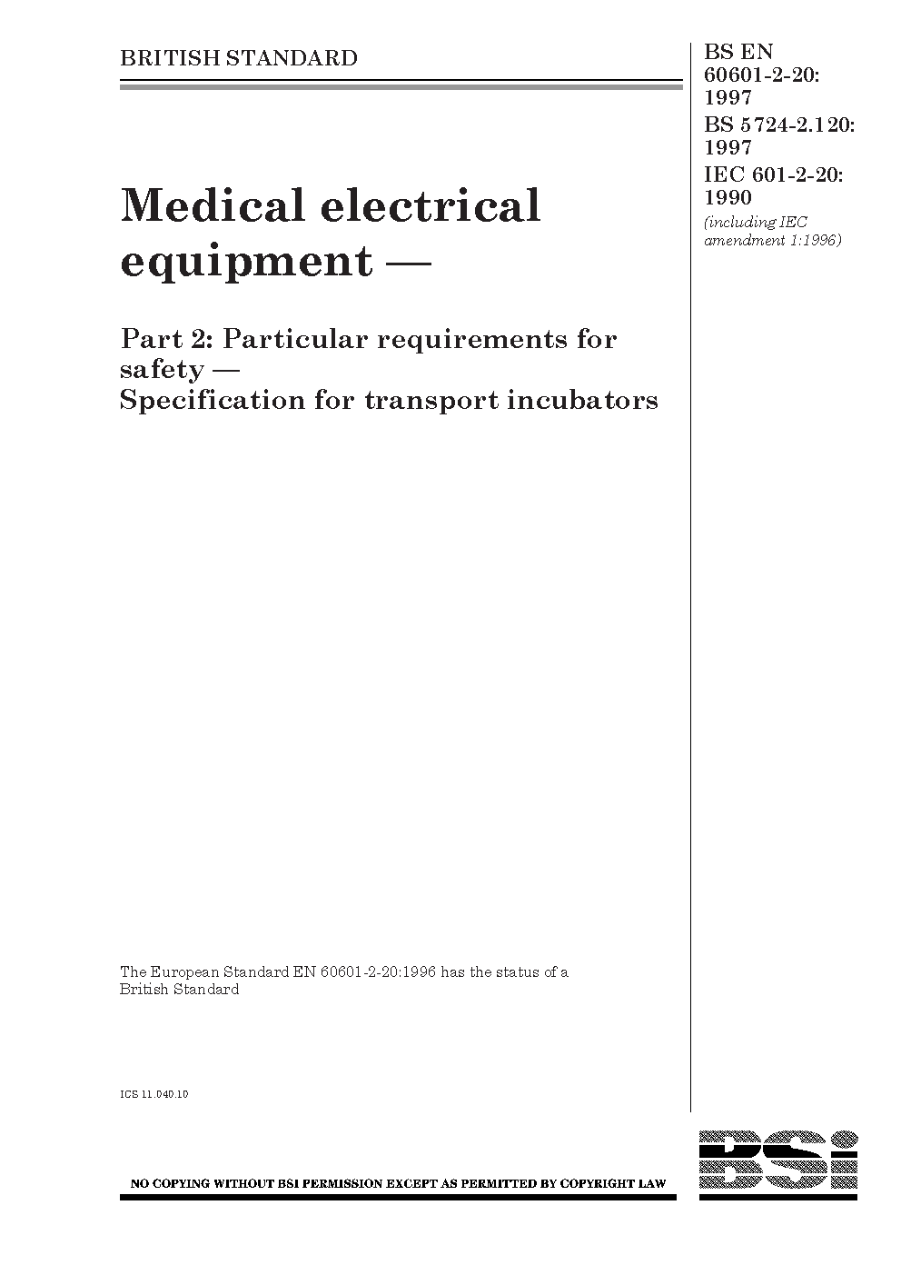 Medical electrical equipment. Particular requirements for safety Specification transport incubators