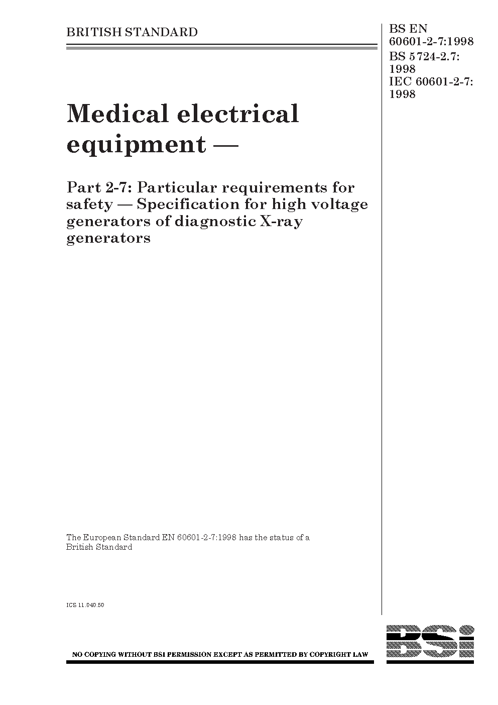 Medical electrical equipment. Particular requirements for safety Specification high voltage generators of diagnostic X-ray