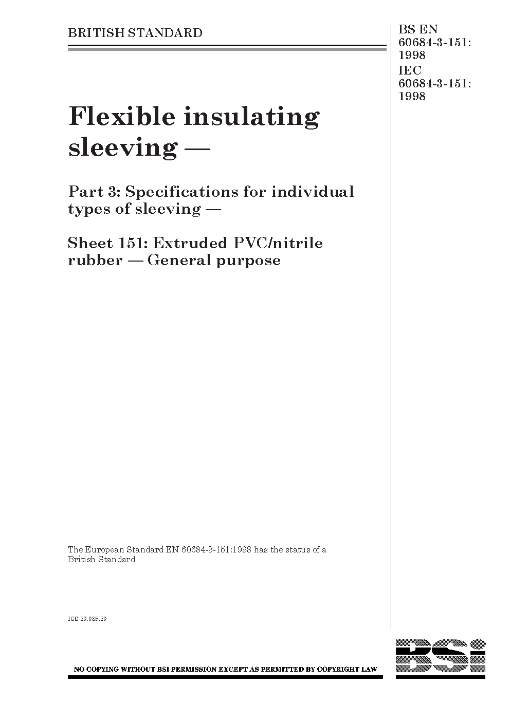 Specification for flexible insulating sleeving. requirements individual types of sleeving Extruded PVC/nitrile rubber. General purpose