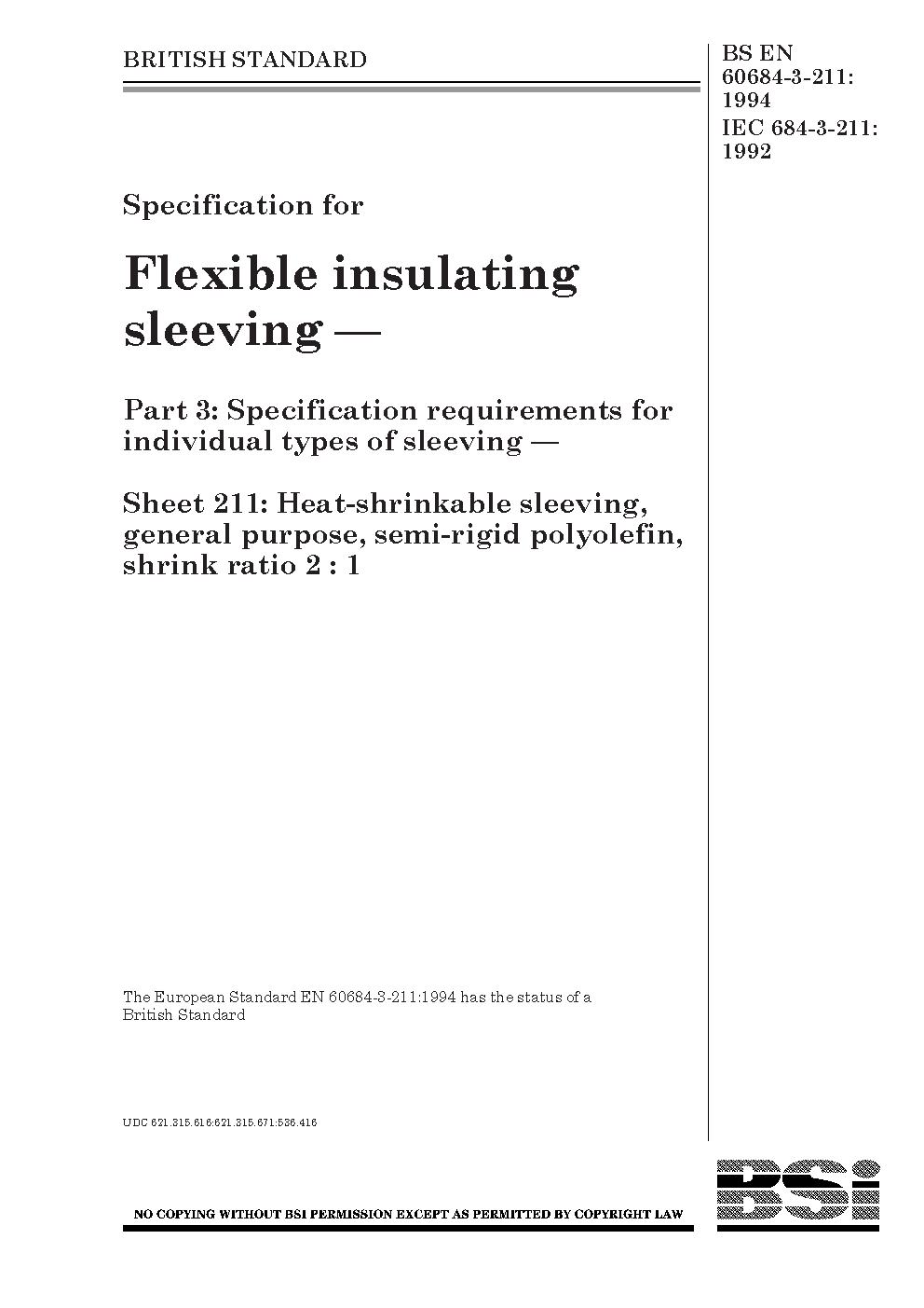 Flexible insulating sleeving Specifications for individual types of Heat-shrinkable sleeving, semi-rigid polyolefin, shrink ratio 2:1