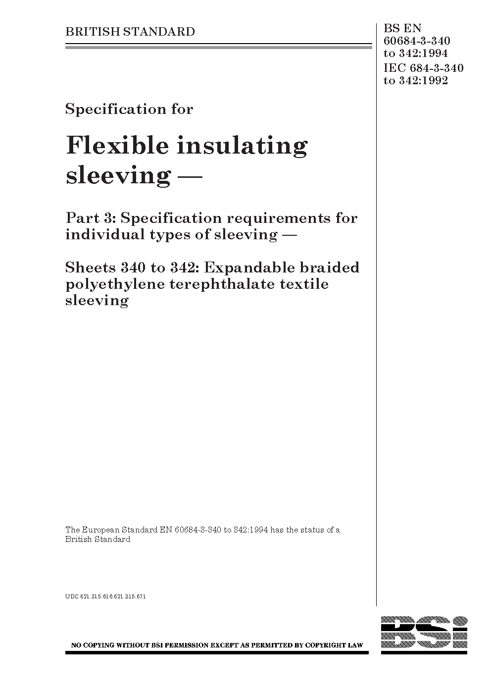 Specification for flexible insulating sleeving. requirements individual types of sleeving Expandable braided polyethylene terephthalate textile