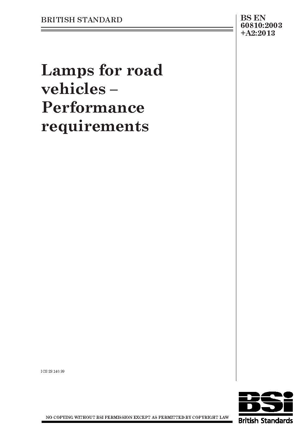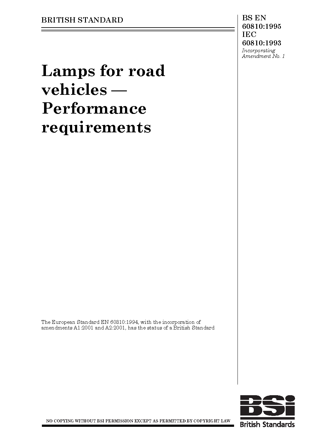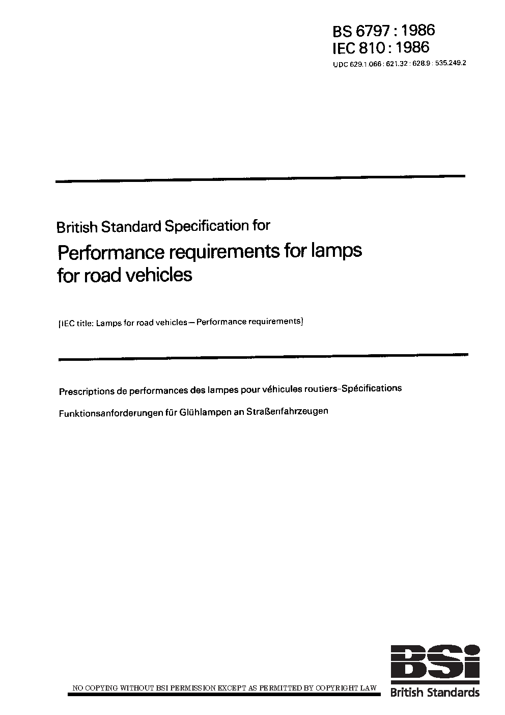 Specification for lamps for road vehicles. Performance requirements