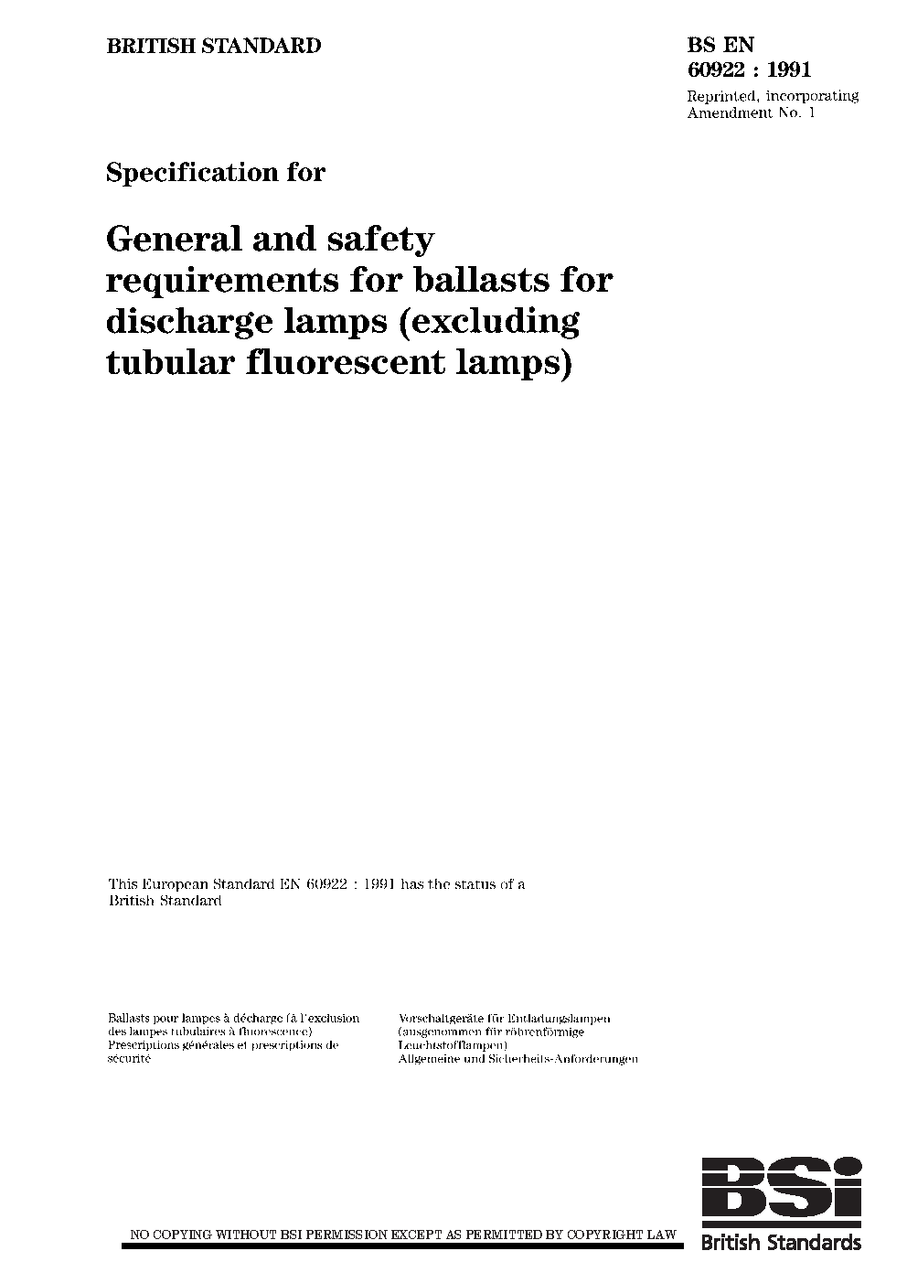 Auxiliaries for lamps. Ballasts for discharge lamps (excluding tubular fluorescent lamps). General and safety requirements