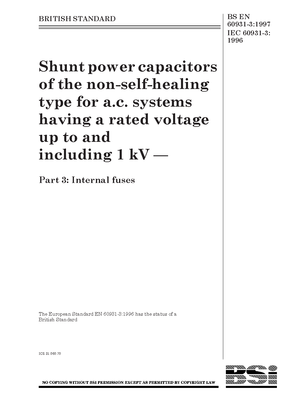 Shunt power capacitors of the non-self-healing type for a.c. systems having a rated voltage up to and including 1000 V Internal fuses