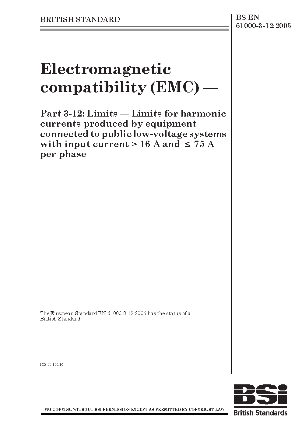 Electromagnetic compatibility (EMC) Limits. Limits for harmonic currents produced by equipment connected to public low-voltage systems with input current > 16 A and = 75 per phase