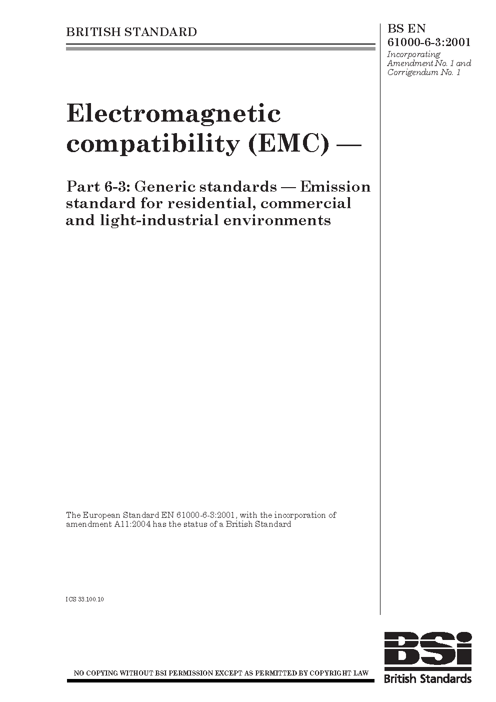 Electromagnetic compatibility (EMC) Generic standards. Emission standard for residential, commercial and light-industrial environments