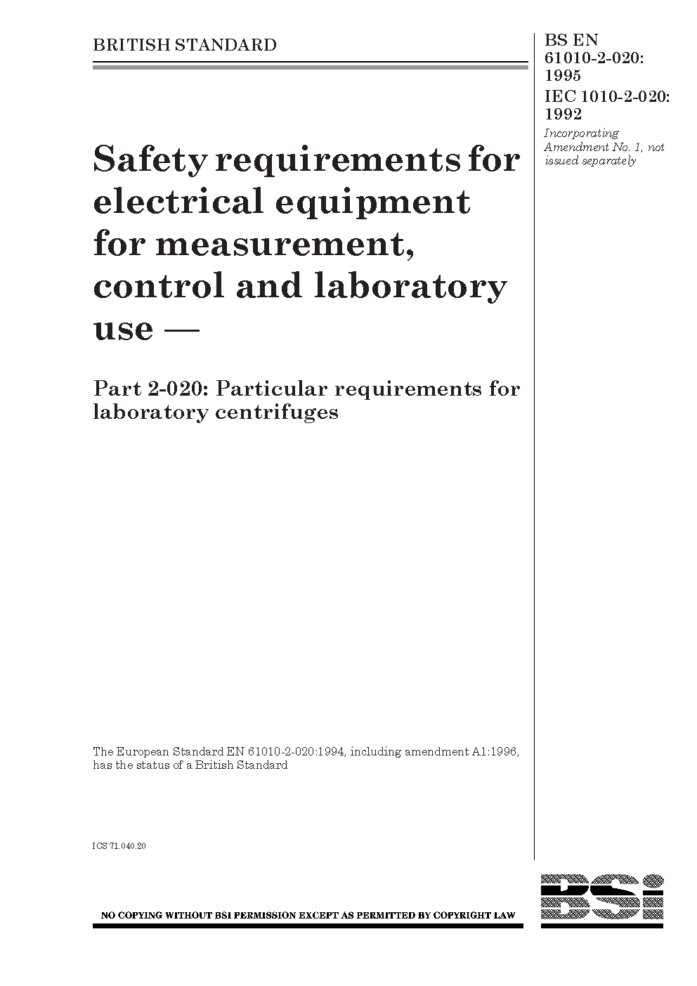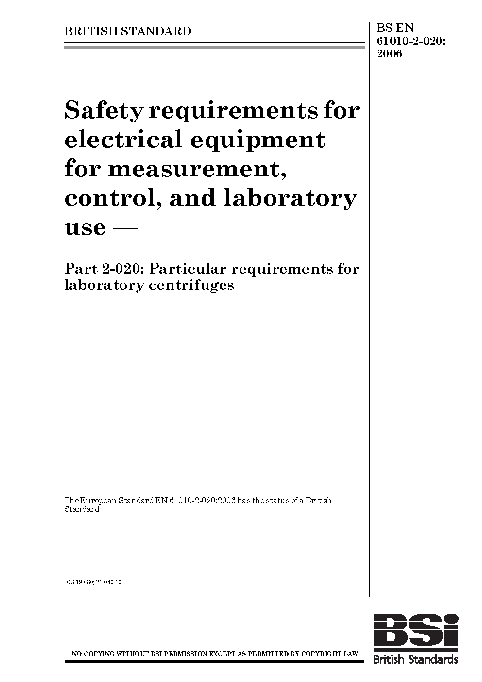 Test equipment;Safety measures;Cleaning;Control devices;Dangerous materials;Electrically-operated devices;Mechanical testing;Electrical equipment;Electrical components;Biological hazards;Biological analysis and testing;Safety devices;Centrifuges;Marking;Centrifuging;Isolating equipment (biomedical);Temperature;Instructions for use;Leak tests;Electrical safety;Covers;Chemical hazards;Sterilization (hygiene);Type testing;Laboratory equipment;Machine guards;Holes;Occupational safety;Environment (working);Design;Lids;Penetration tests;Impact strength;Equipment safety;Electronic equipment and components;Contamination;Interlocks