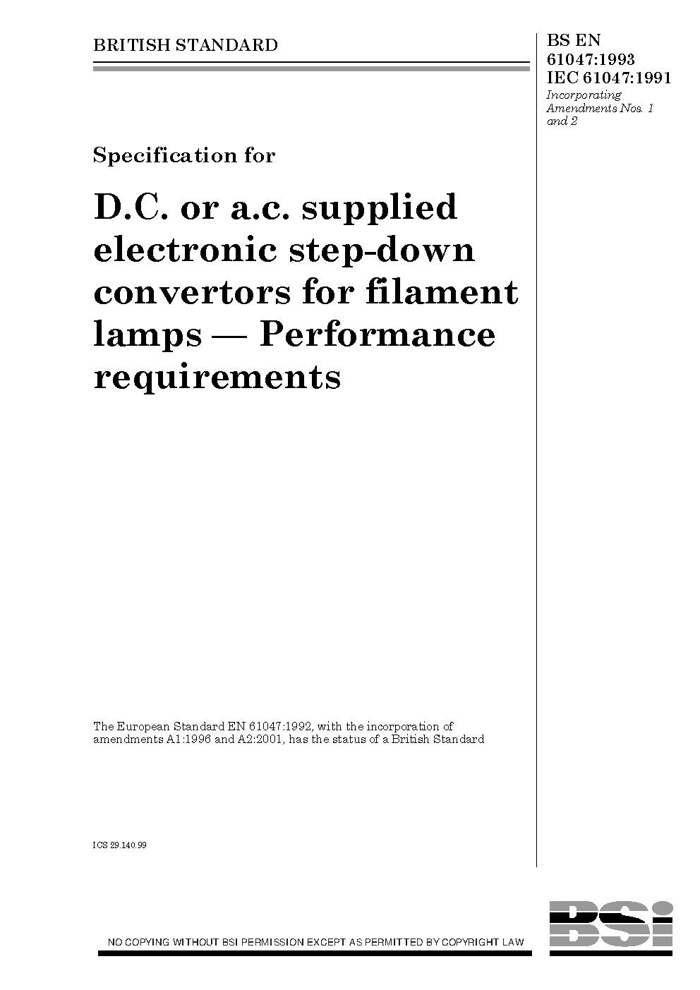 D.C. or A.C. supplied electronic step-down convertors for filament lamps. Performance requirements
