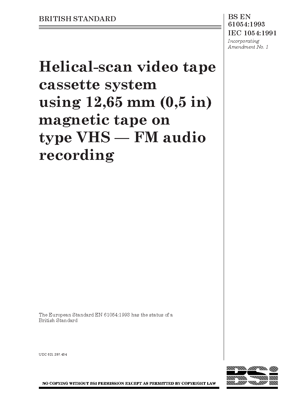 Helical-scan video tape cassette system using 12.65 mm (0.5 in) magnetic tape on type VHS. FM audio recording