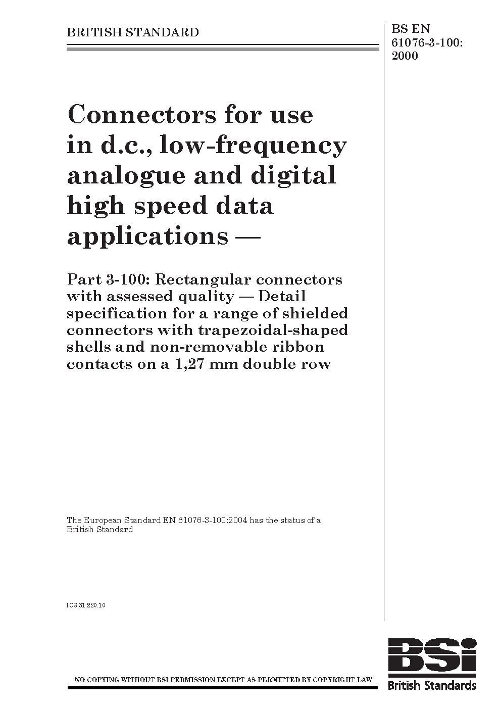 Connectors for use in d.c., low-frequency analogue and digital high-speed data applications Rectangular connectors with assessed quality Detail specification a range of shielded trapezoidal-shaped shells non-removable ribbon contacts on 1,27 mm double row