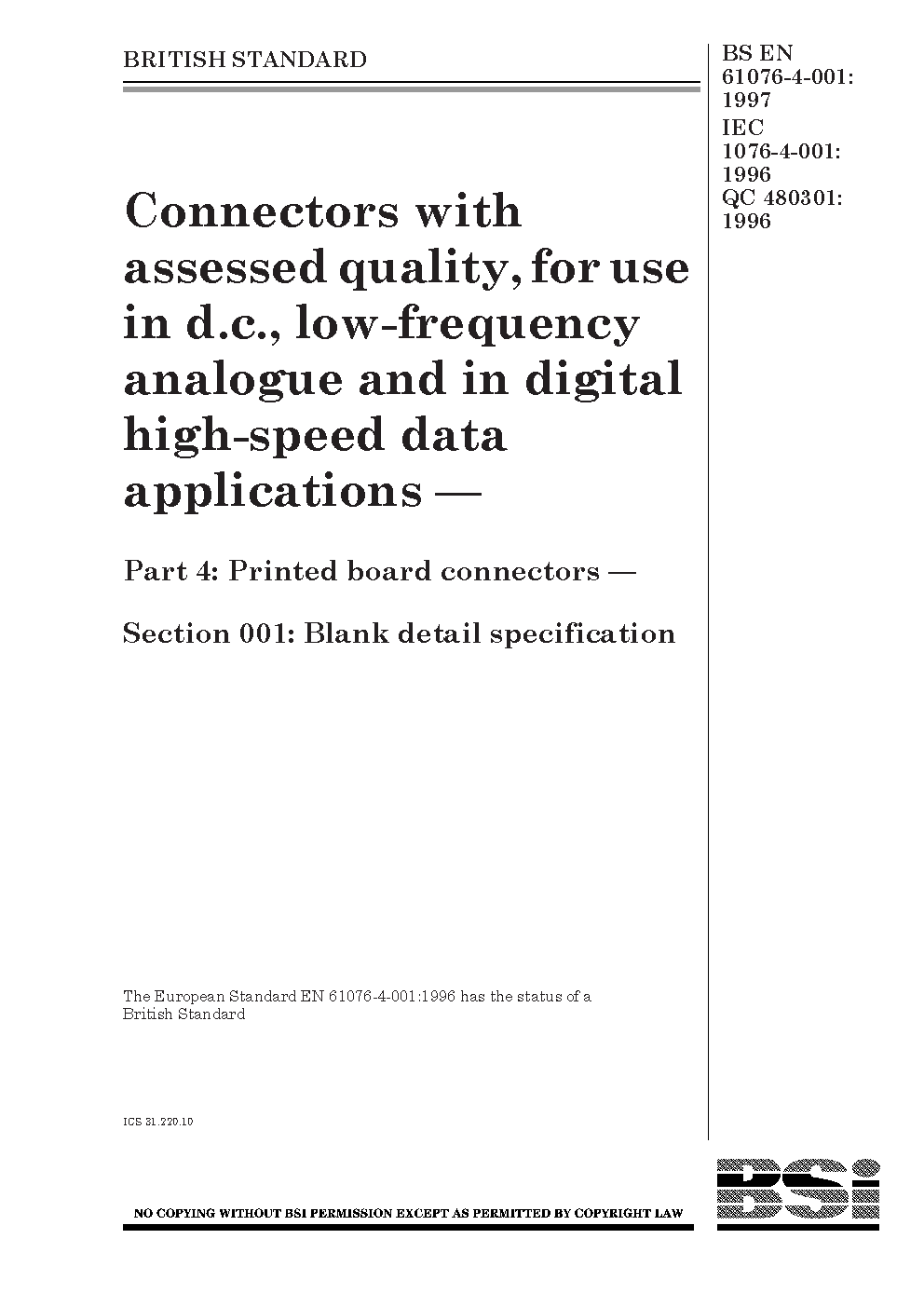 Digital circuits;Dimensions;Endurance testing;Approval testing;Direct current;Performance;Analogue circuits;Marking;Electric connectors;Mechanical testing;Designations;Inspection;Assessed quality;Printed circuits;Printed-circuit boards;Statistical quality control;Gauges;Electrical equipment;Layout;Electrical testing;Seating;Quality control;Specification (approval);Qualification approval;Quality assurance;Detail specification;Performance testing;Electronic equipment and components;Quality assurance systems;Low frequencies