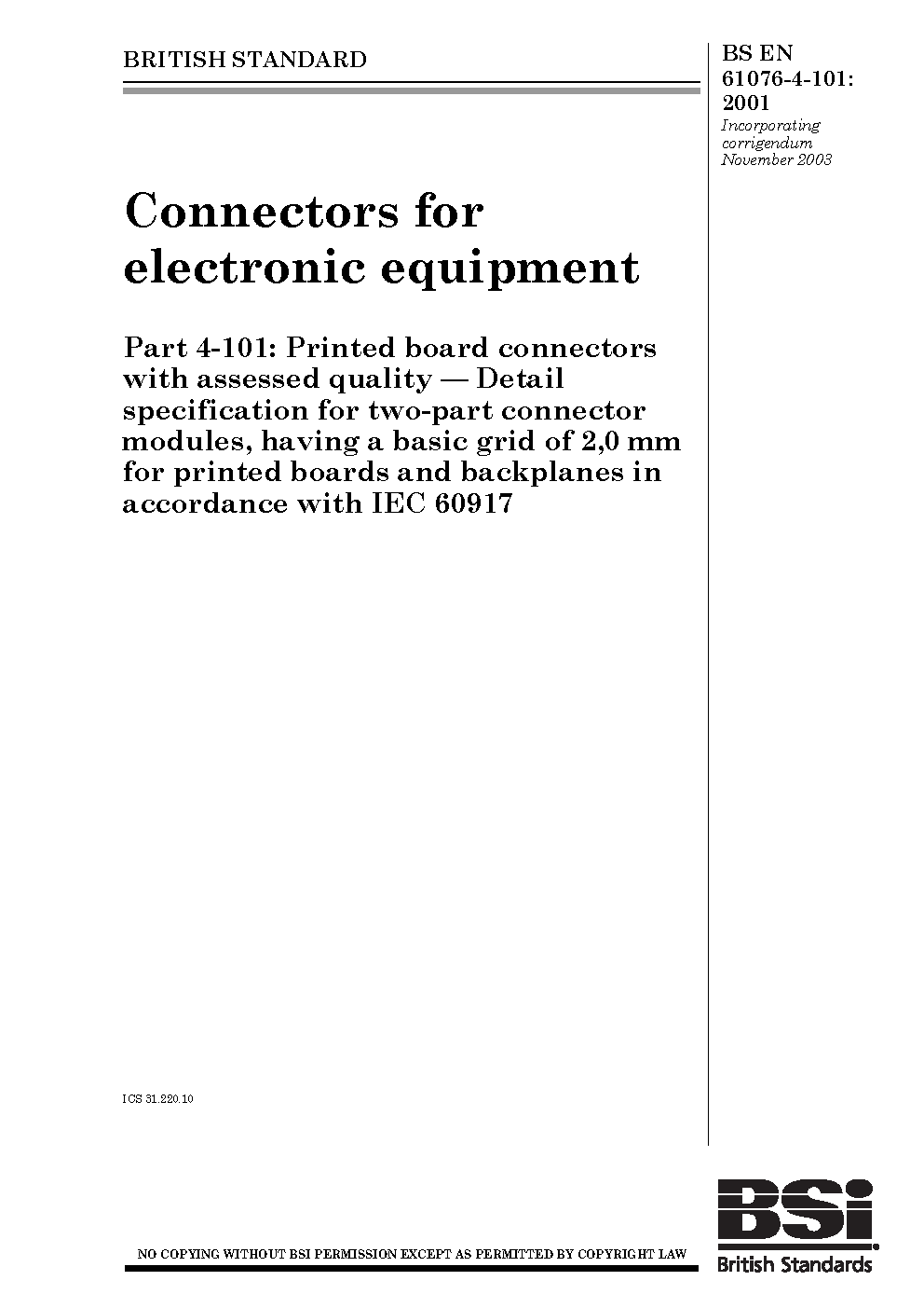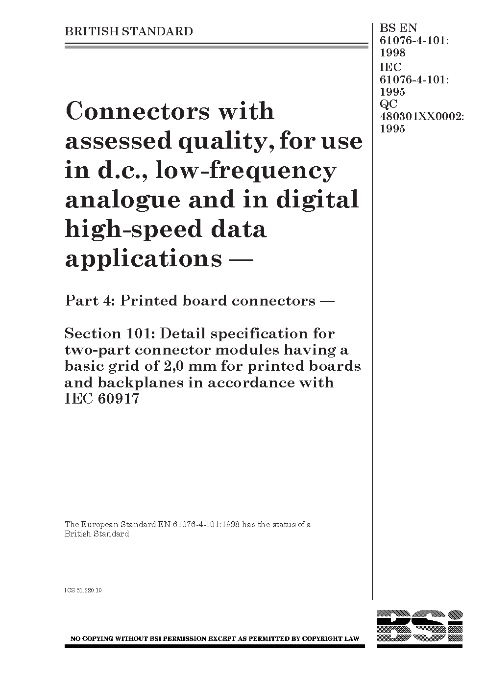 Connectors for electronic equipment Printed board connectors with assessed quality. Detail specification two-part connector modules, having a basic grid of 2,0 mm printed boards and backplanes in accordance IEC 60917