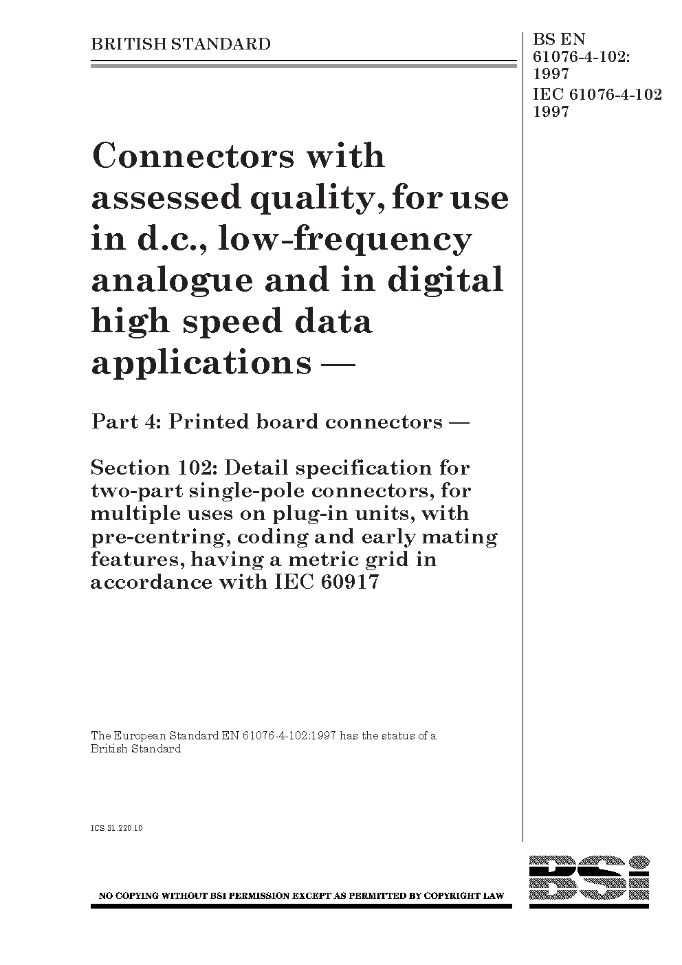 Connectors with assessed quality, for use in d.c., low-frequency analogue and digital high speed data applications. Printed board connectors Detail specification two-part single-pole connectors, multiple uses on plug-in units, pre-centring, coding early mating features, having a metric grid accordance IEC 60917