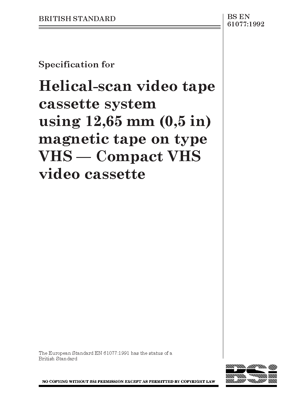 Specification for helical-scan video tape cassette system using 12,65 mm (0,5 in) magnetic tape on type VHS. Compact VHS video cassette