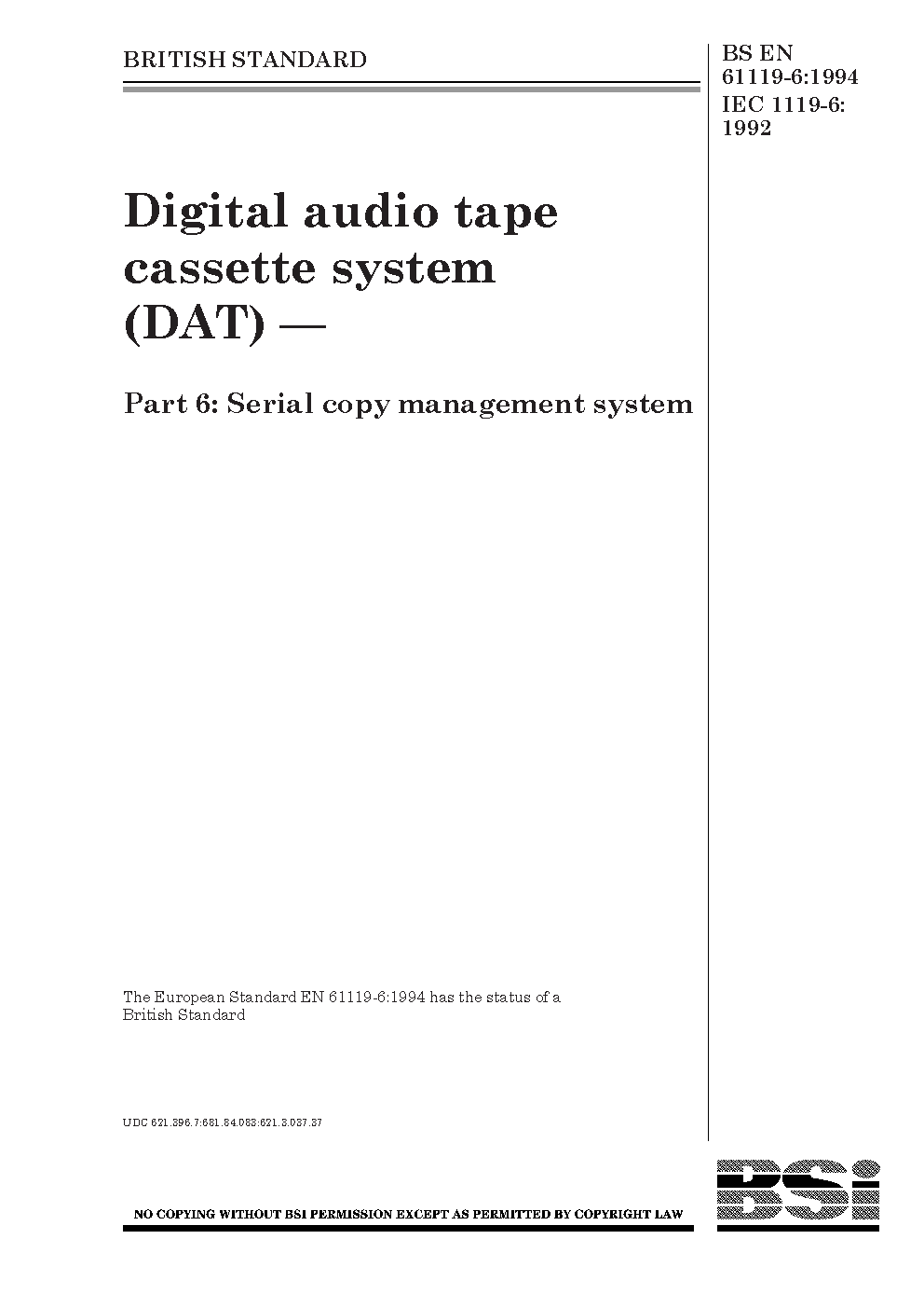 Cassettes (magnetic tapes);Magnetic tape equipment;Coding (data conversion);Magnetic recorders;Recording media;Digital signals;Copyright;Interfaces (data processing);Duplicating;Codes;Sound recording;Digital recording methods;Tape recorders;Audio tapes;Magnetic tapes;Data recording;Data media;Recording equipment;Recording equipment components
