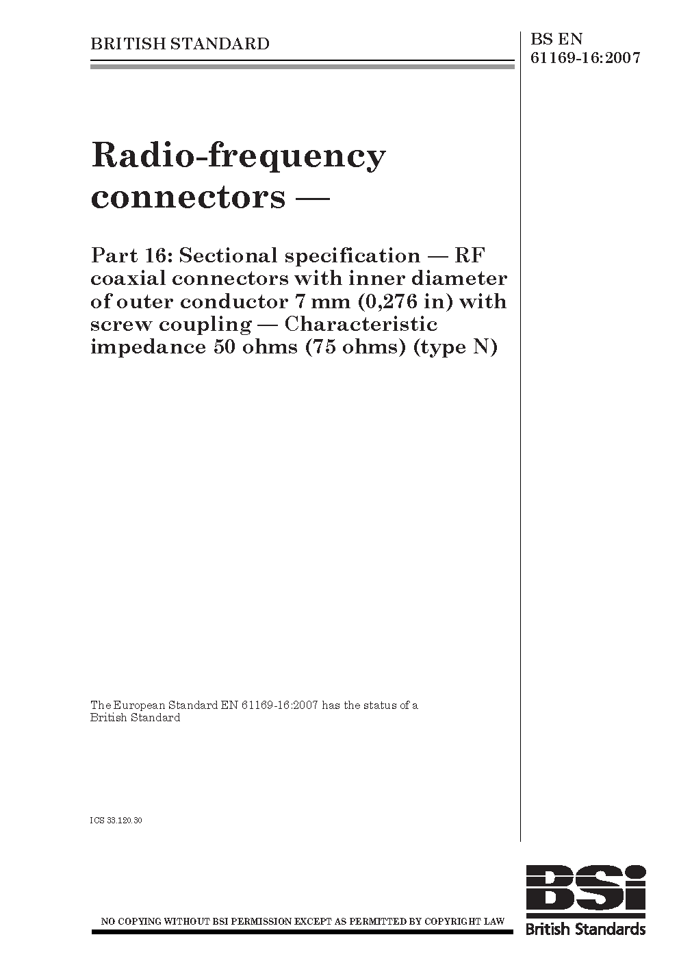 Radio-frequency connectors Sectional specification. RF coaxial with inner diameter of outer conductor 7 mm (0,276 in) screw coupling. Characteristic impedance 50 ohms (75 ohms) (type N)
