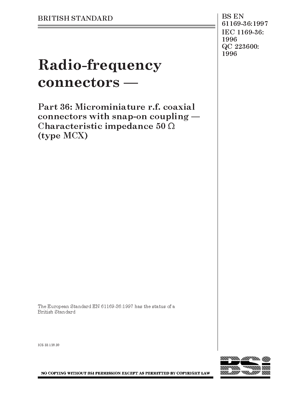 Radio-frequency connectors Microminiature r.f. coaxial with snap-on coupling. Characteristic impedance 50 ohms (type MCX)
