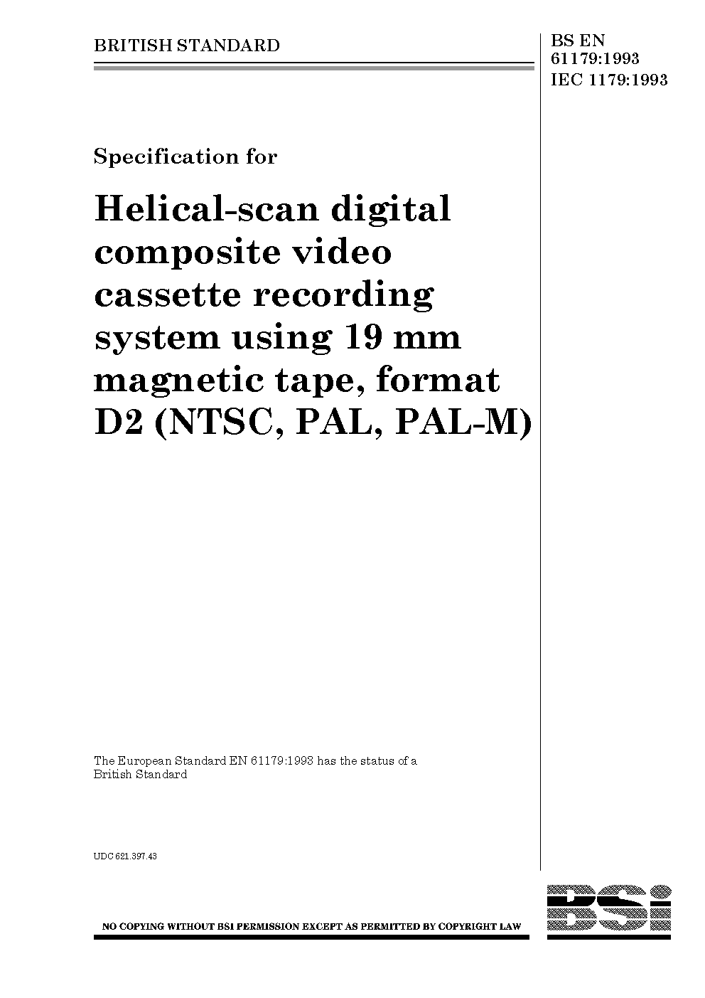 Specification for helical-scan digital composite video cassette recording system using 19 mm magnetic tape, format D2 (NTSC, PAL, PAL-M)