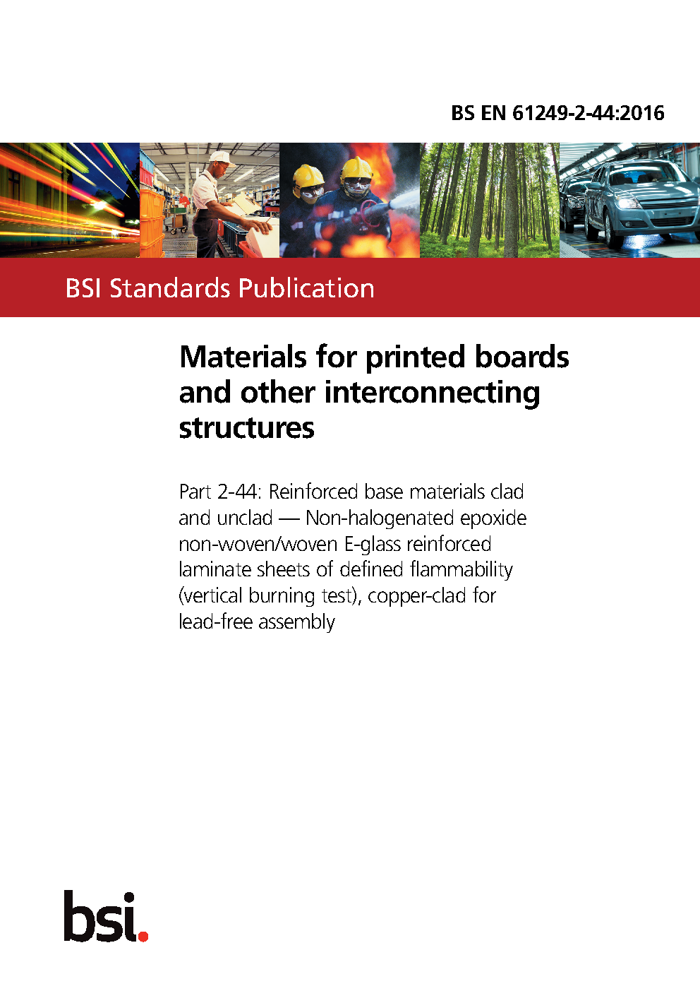 Materials for printed boards and other interconnecting structures Reinforced base materials clad unclad. Non-halogenated epoxide non-woven/woven E-glass reinforced laminate sheets of defined flammability (vertical burning test), copper-clad lead-free assembly