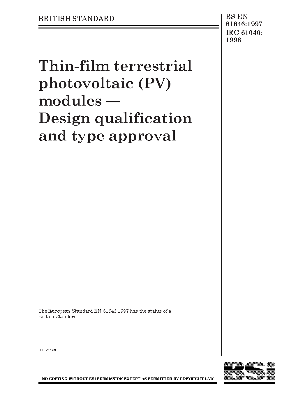 Photovoltaic cells;Electrical testing;Design;Specimen preparation;Marking;Damp-heat tests;Performance testing;Testing conditions;Photoelectric cells;Test equipment;Type testing;Environmental testing;Qualification approval;Endurance testing;Thin-film devices;Quality control;Thermal-cycling tests;Visual inspection (testing)
