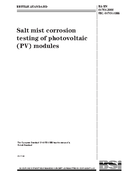Test equipment;Corrosion tests;Homogeneity;Photovoltaic cells;Photoelectric cells;Solar cells;Quality assurance;Testing conditions;Salt-spray tests;Photoelectric devices;Test specimens;Compatibility;Surface treatment;Coatings