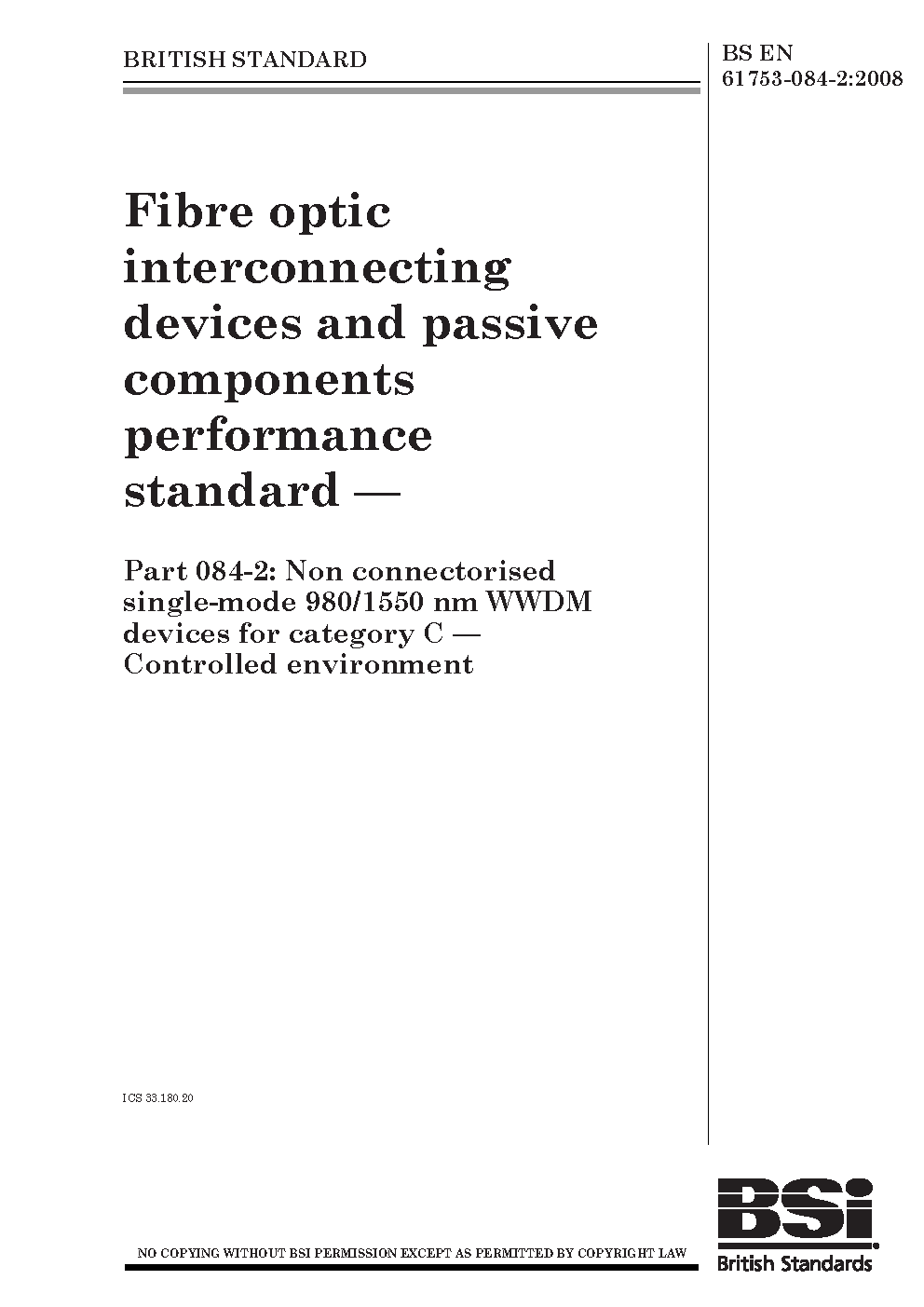 Fibre optic interconnecting devices and passive components performance standard Non connectorised single-mode 980/1550 nm WWDM for category C. Controlled environment
