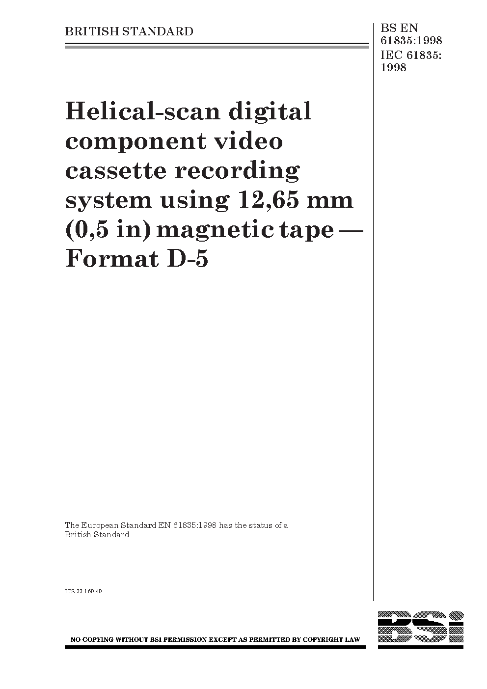 Helical-scan digital component video cassette recording system using 12,65 mm (0,5 in) magnetic tape. Format D-5