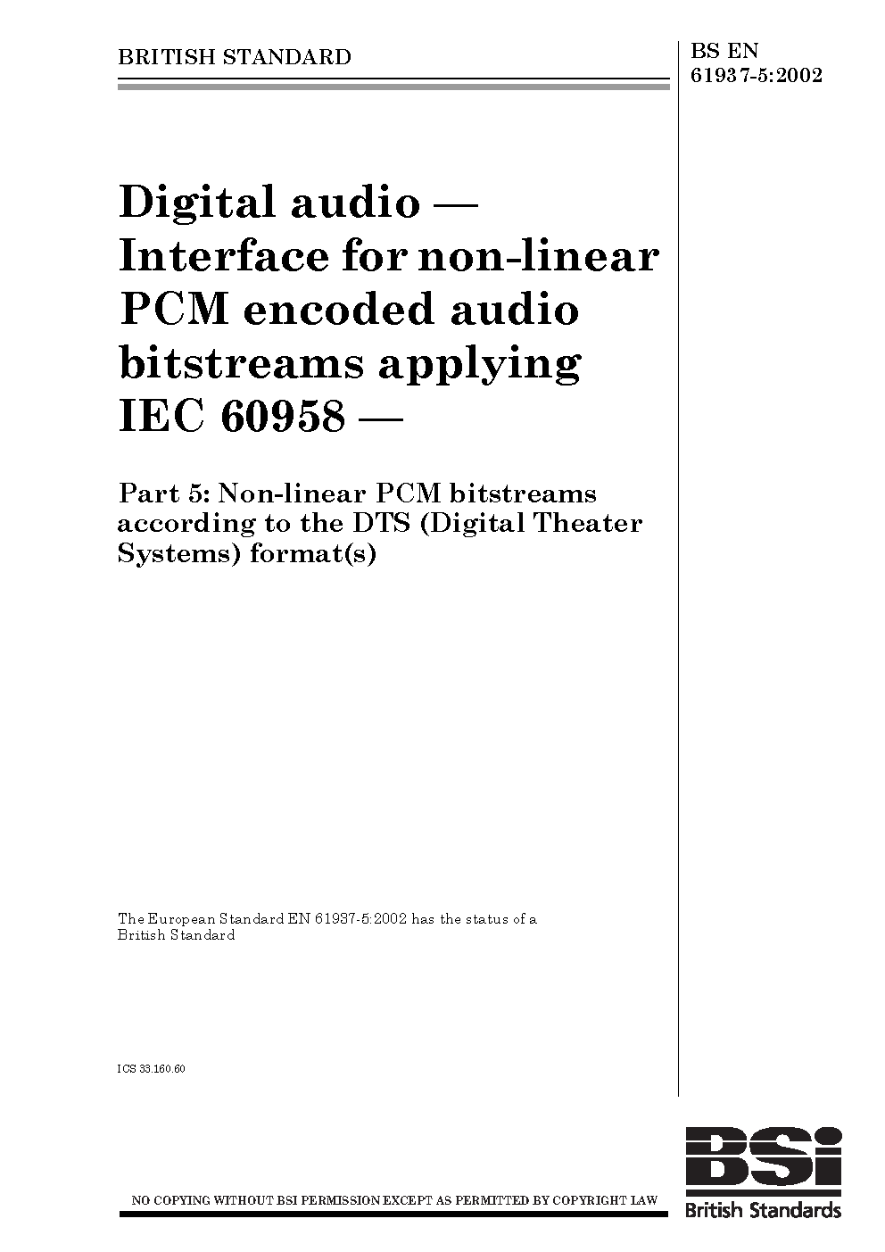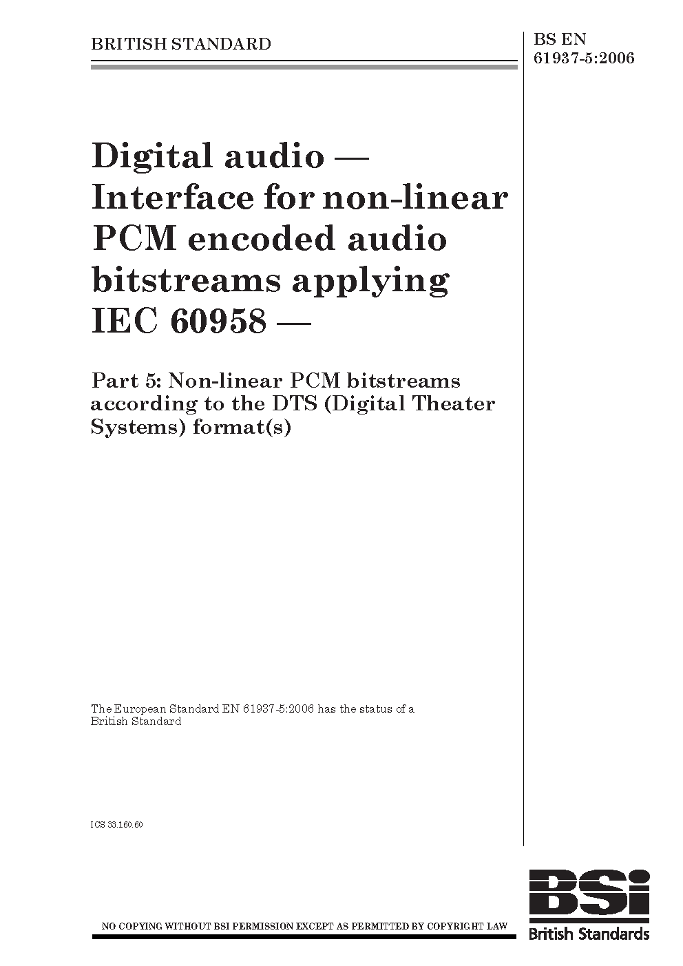 Digital audio. Interface for non-linear PCM encoded audio bitstreams applying IEC 60958 Non-linear according to the DTS (digital theatre systems) format(s)