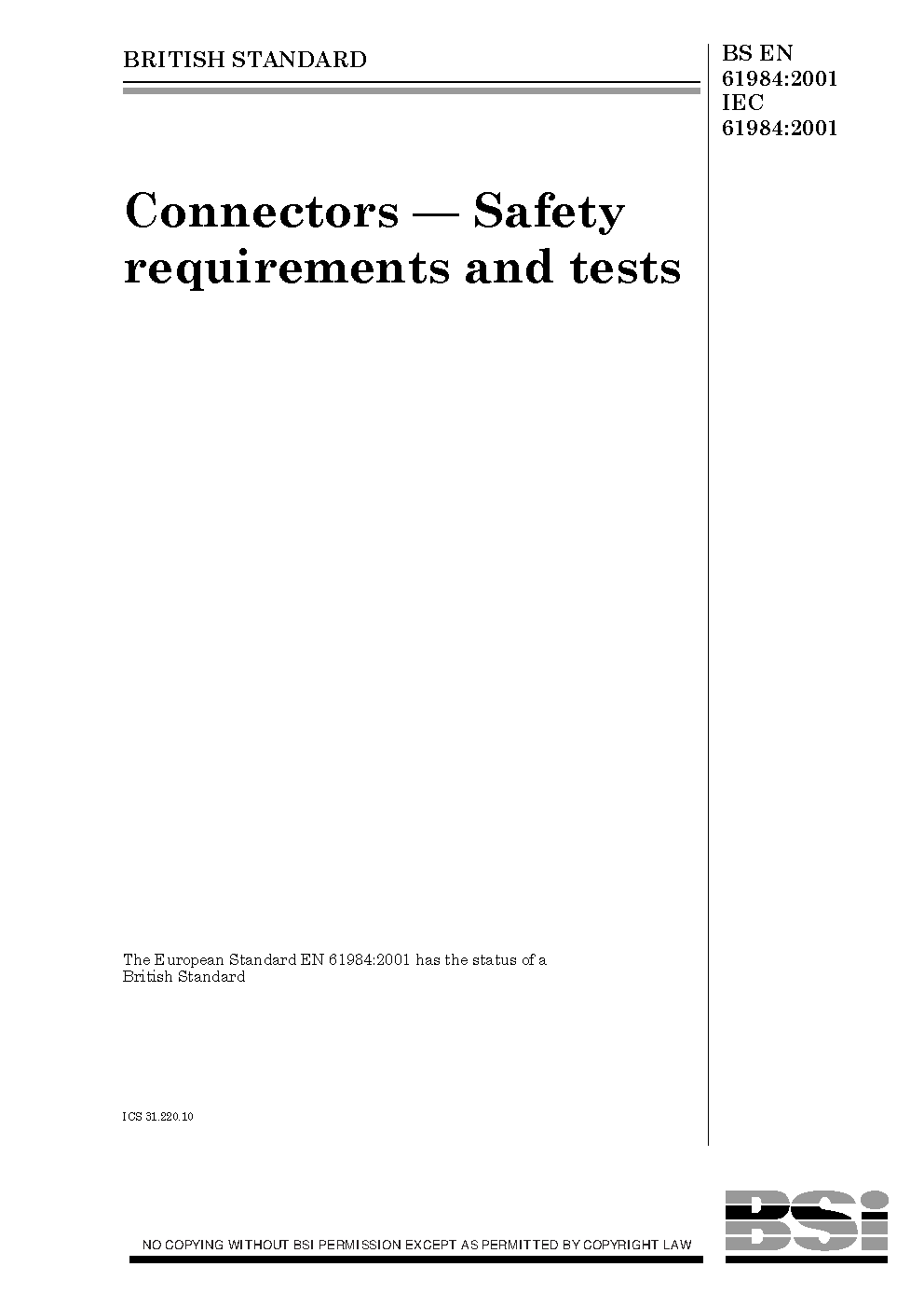 Marking;Testing conditions;Electric connectors;Classification systems;Electric shocks;Electrical safety;Rated voltage;Electrical connections;Detail specification;Earthing;Electrical components;Electrical testing;Rated current