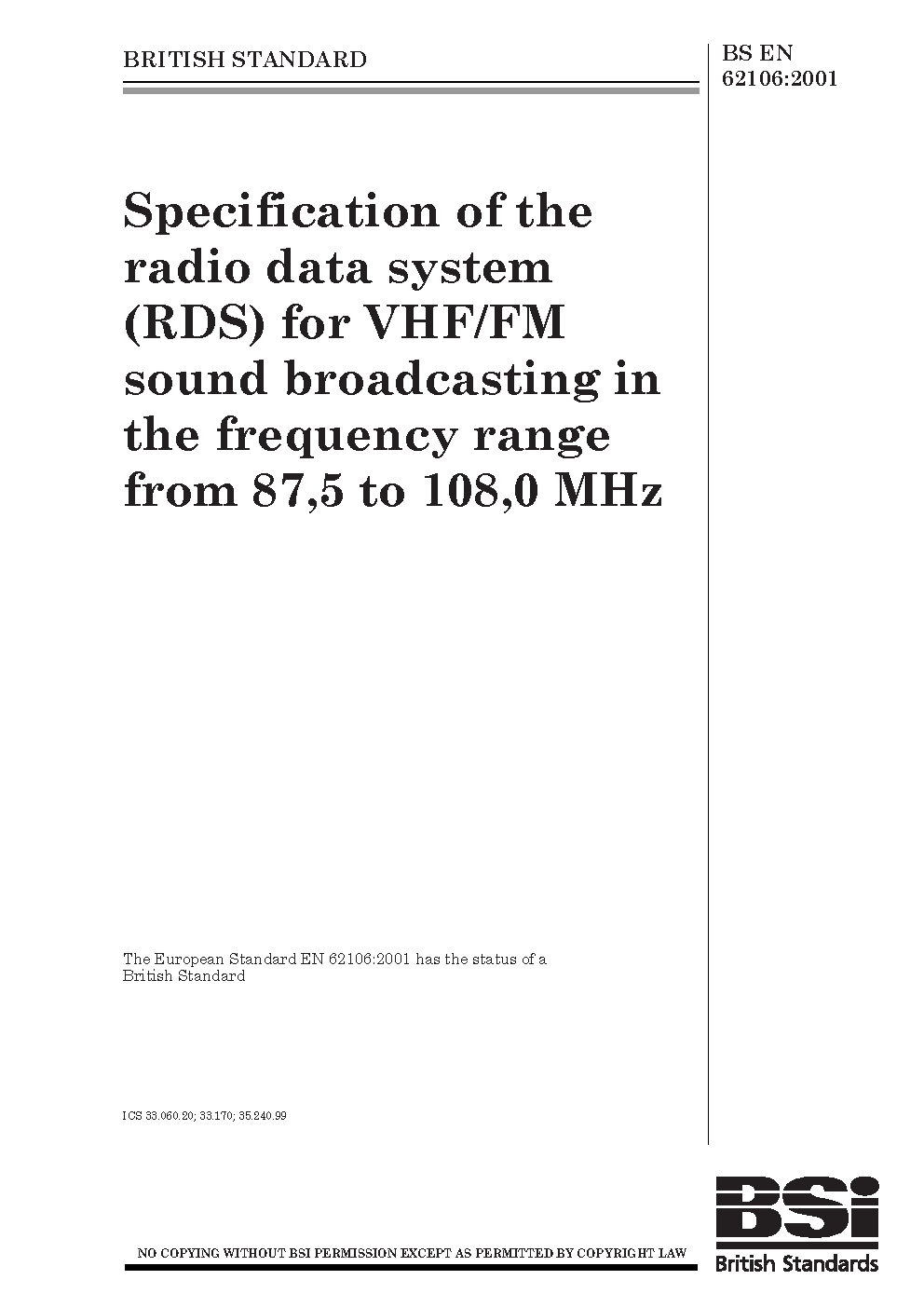 Specification of the radio data system (RDS) for VHF/FM sound broadcasting in the frequency range from 87,5 MHz to 108,0 MHz