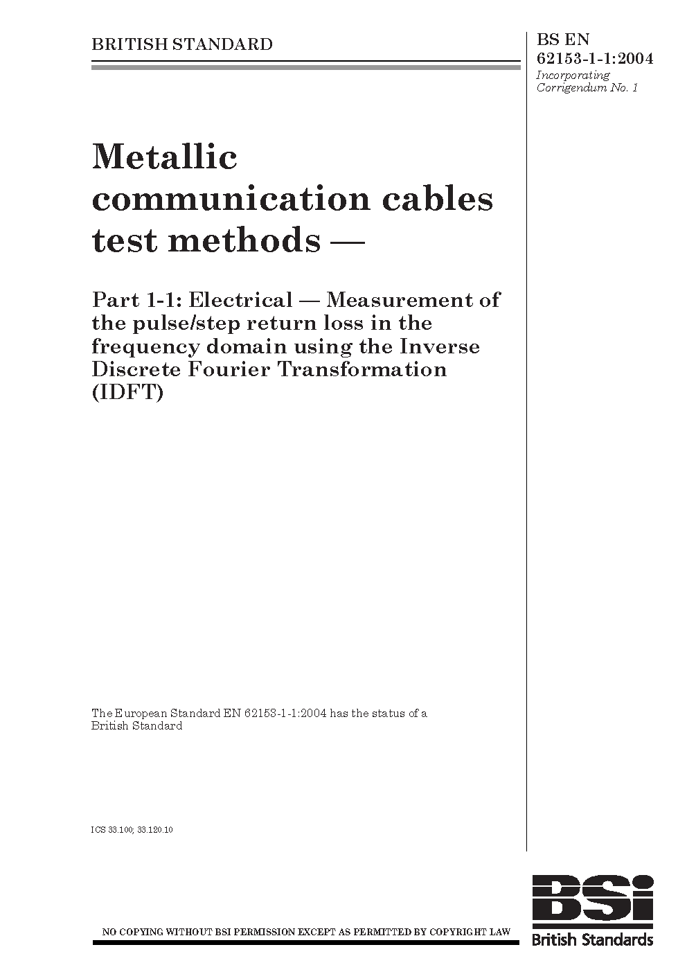Metallic communication cables test methods Electrical. Measurement of the pulse/step return loss in frequency domain using inverse discrete fourier transformation (IDFT)