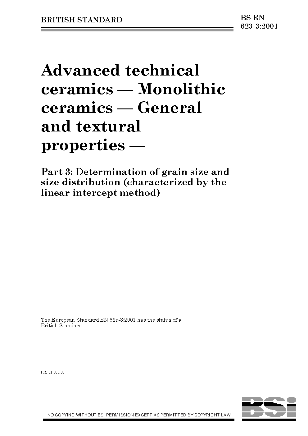 Advanced technical ceramics. Monolithic General and textural properties Determination of grain size distribution (characterized by the linear intercept method)