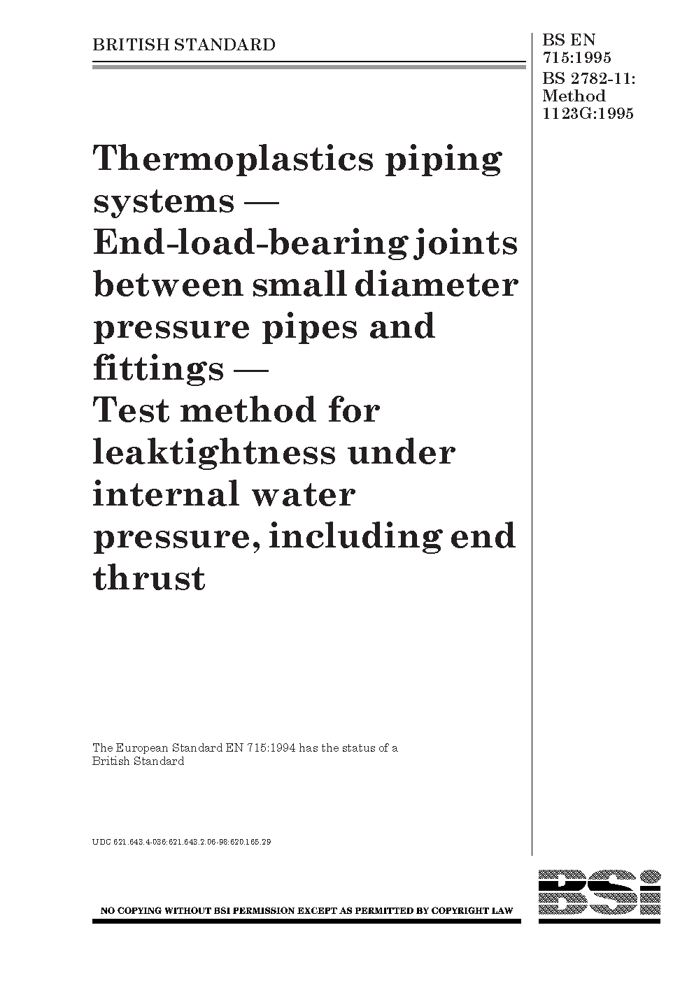 Thermoplastics piping systems. End-load-bearing joints between small diameter pressure pipes and fittings. Test method for leaktightness under internal water pressure, including end thrust