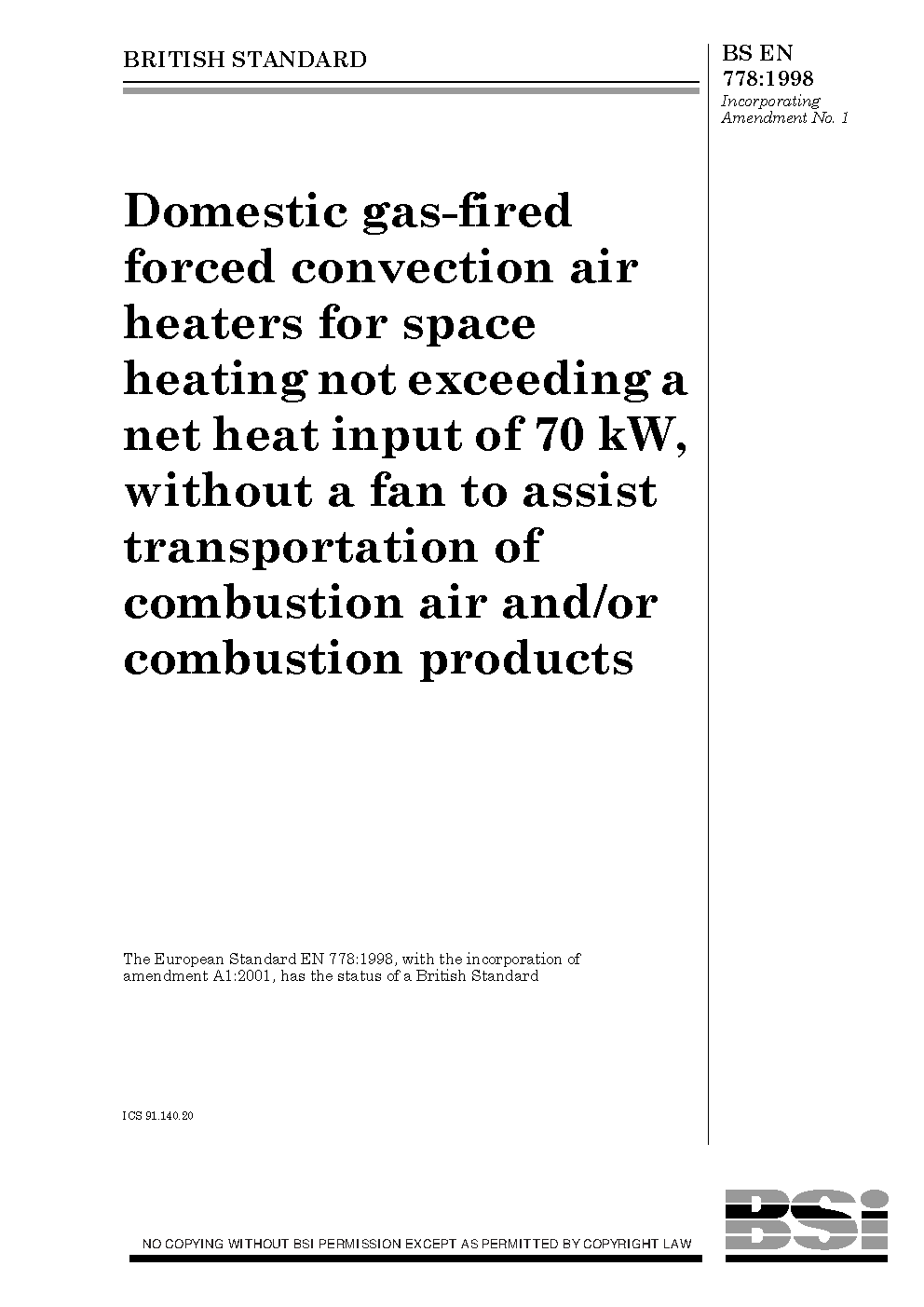 Domestic gas-fired forced convection air heaters for space heating not exceeding a net heat input of 70 kW, without a fan to assist transportation of combustion air and/or combustion products