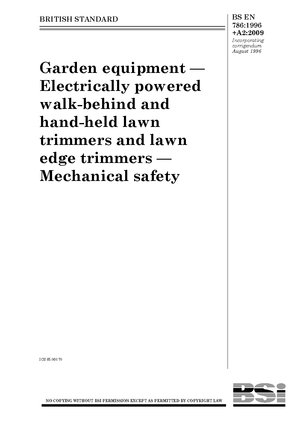 Lawn-mowers;Instructions for use;Safety measures;Cutting;Testing conditions;Electrically-operated devices;Handles;Mechanical testing;Equipment safety;Drop tests;Mowers;Impact testing;Graphic symbols;Gardening equipment;Grass trimmers;Horticultural equipment;Machine guards;Hazards;Marking