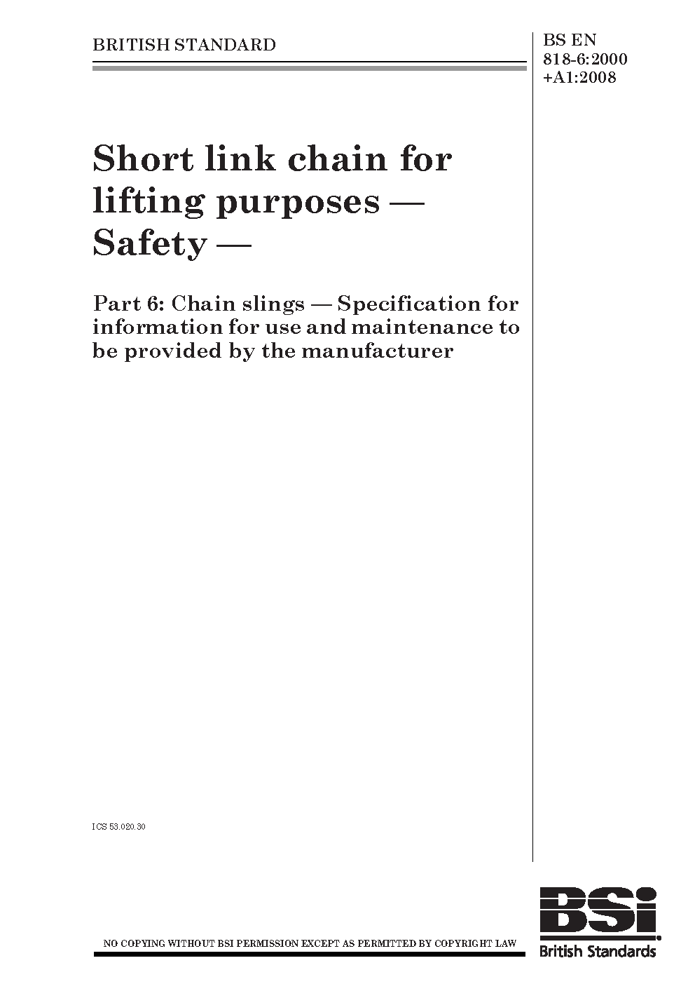 Short link chain for lifting purposes. Safety Chain slings. Specification information use and maintenance to be provided by the manufacturer