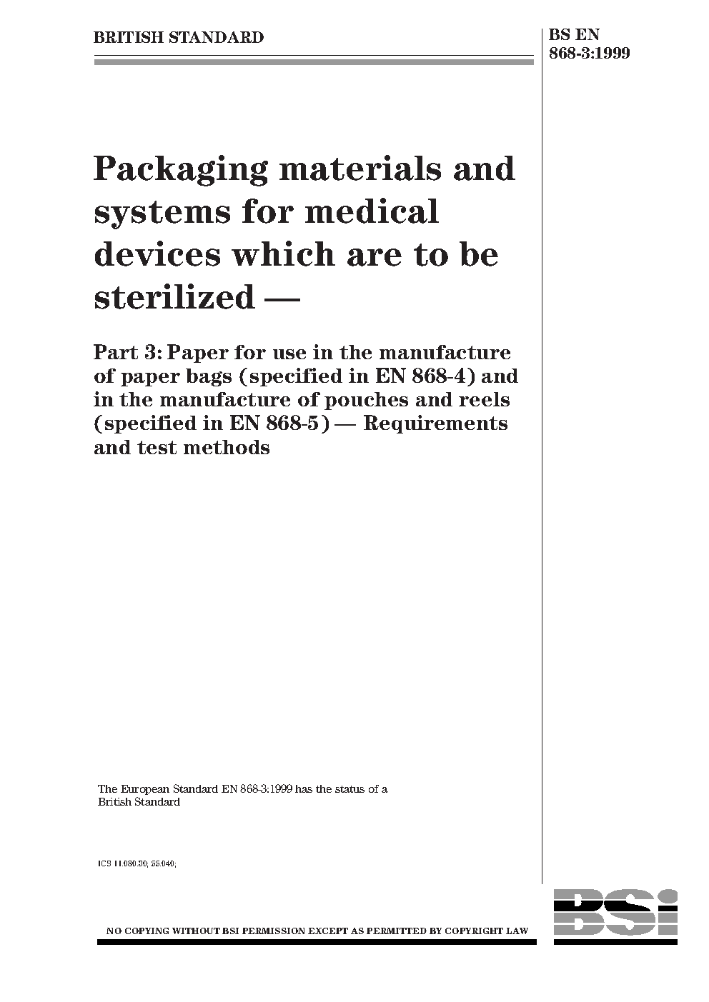 Packaging materials and systems for medical devices which are to be sterilized Paper use in the manufacture of paper bags (specified EN 868-4) pouches reels 868-5). Requirements test methods