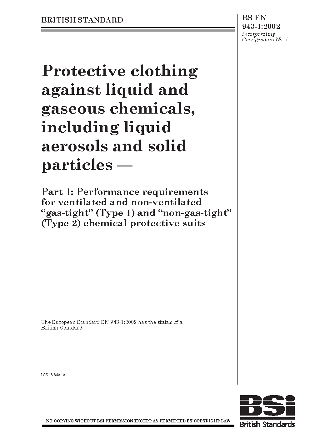 Protective clothing against liquid and gaseous chemicals, aerosols solid particles Performance requirements for ventilated non-ventilated "gas-tight" (Type 1) "non-gas-tight" 2) chemical protective suits