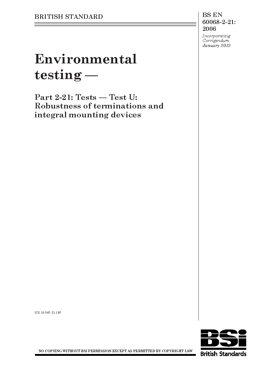 Environmental testing Tests. Test U: Robustness of terminations and integral mounting devices